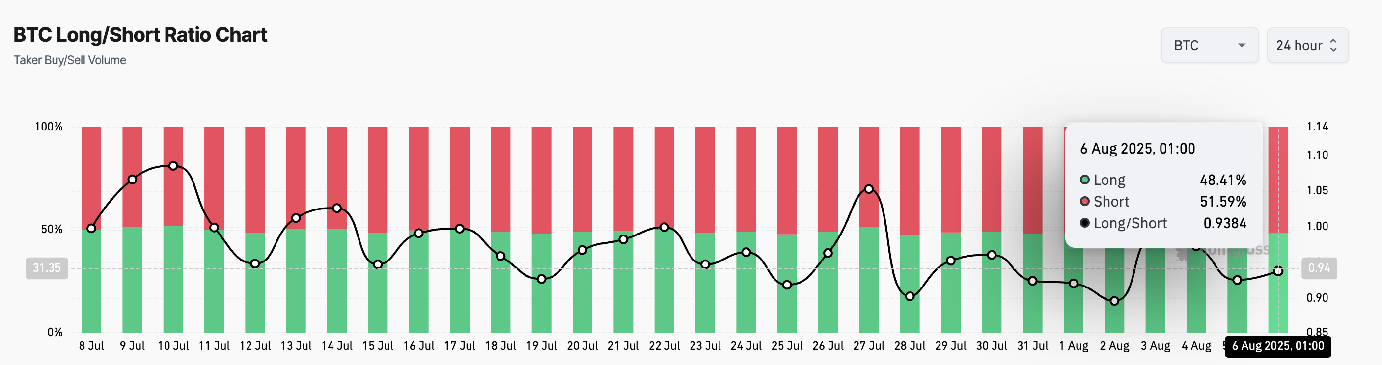 På den annen side, som med den ledende mynten, betyr en long/short ratio under én at flere tradere satser på at aktivumets pris vil falle enn de som forventer at den vil stige.