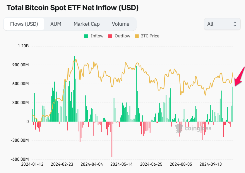Ifølge data fra Coinglass, den 14. oktober, registrerte alle spot Bitcoin ETF-er en inngang på $ 555,90 millioner. I tillegg nådde den totale handelsvolumen for Bitcoin ETF-er $ 2,78 milliarder, det høyeste siden 25. august.