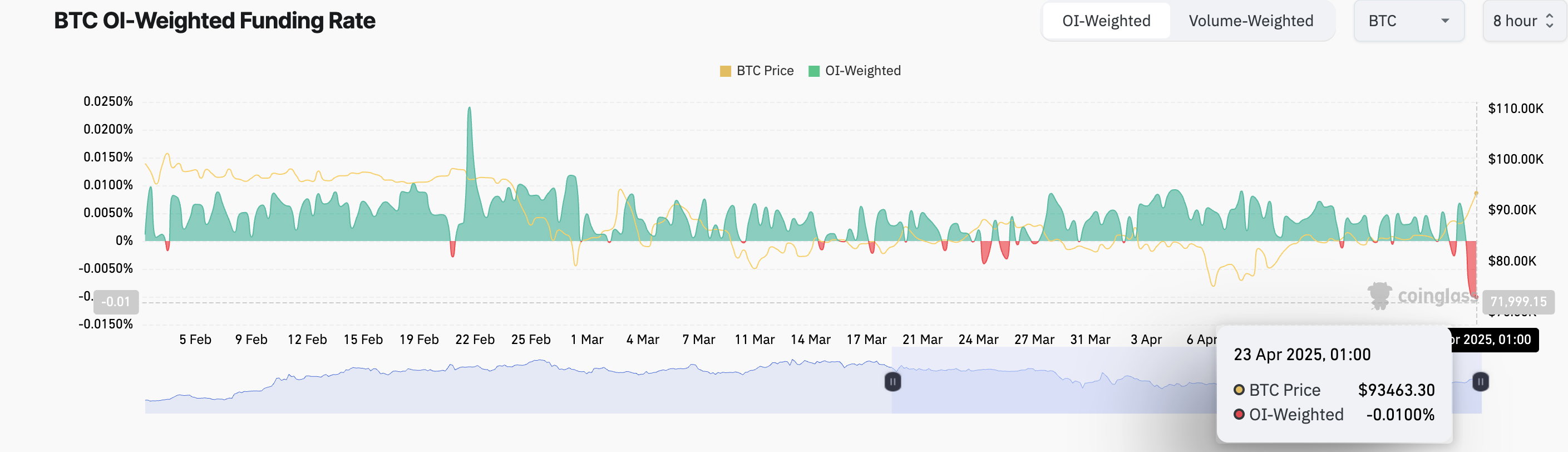Til tross for BTCs prisøkning det siste døgnet, forblir finansieringsraten negativ, noe som tyder på at tradere betaler en premie for å shorte mynten i futuresmarkedene. Myntens finansieringsrate er for øyeblikket på -0,01 %.