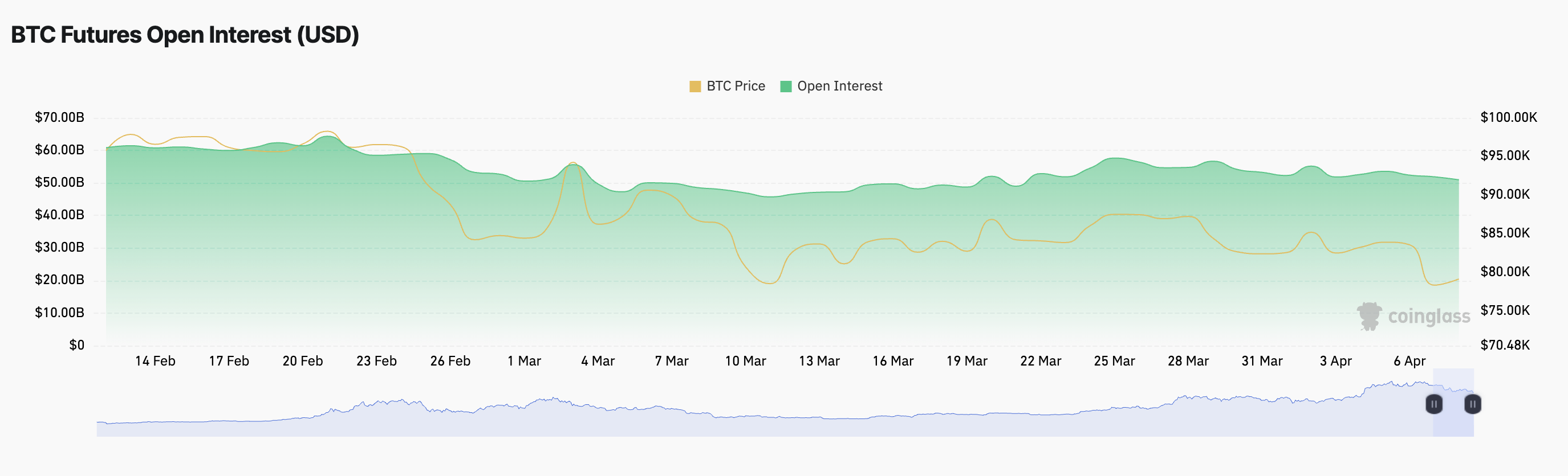 Ettersom BTC sliter under $ 80 000, fortsetter handelsaktiviteten å falle. Dette gjenspeiles i myntens fallende futures åpen interesse, som står på $ 50,95 milliarder i skrivende stund, og noterer en nedgang på 2 % over prisdagen.
