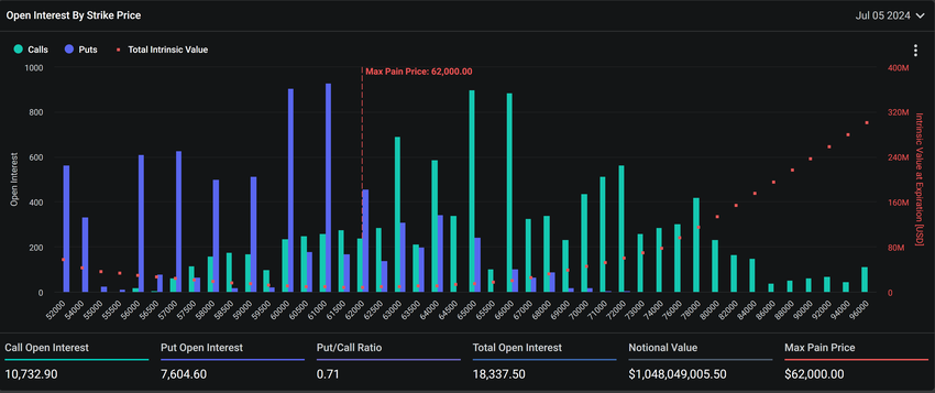 Utløpende Bitcoin-opsjoner har en nominell verdi på 1,04 milliarder dollar, med 18 339 kontrakter som utløper. Disse kontraktene har et put-to-call-forhold på 0,71 og et maksimalt smertepunkt på $ 62,000.