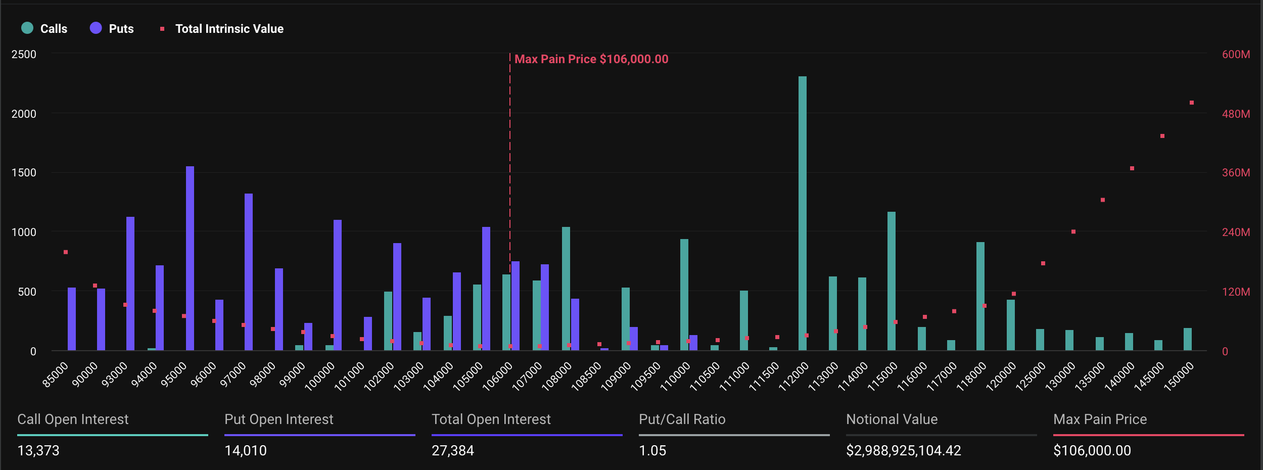 Begge aktivaene handles over sine maksimale smertenivåer. I skrivende stund var Bitcoin handlet til $ 109 130, over sitt maksimale smertepris på $ 106 000. Tilsvarende var ETHs pris på pressetidspunktet $ 2 577, mer enn sitt maksimale smertenivå på $ 2 500.
