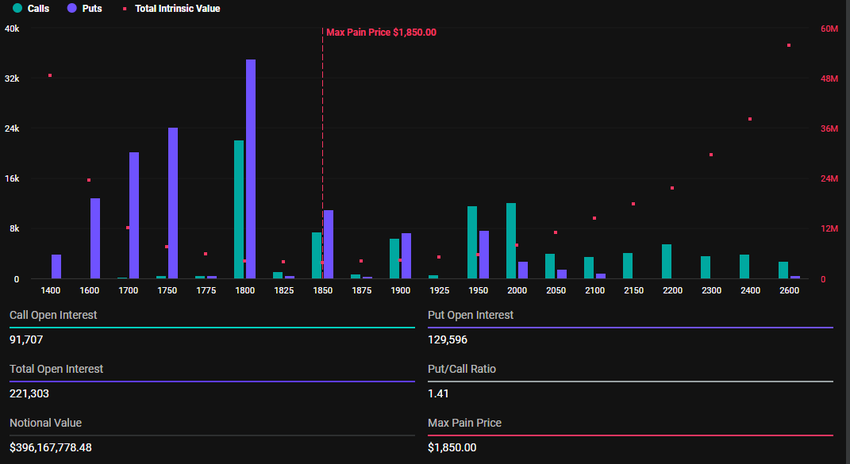 Av dette totalbeløpet utgjør Bitcoin (BTC) opsjoner $ 2,18 milliarder, mens Ethereum (ETH) opsjoner representerer $ 396,16 millioner.