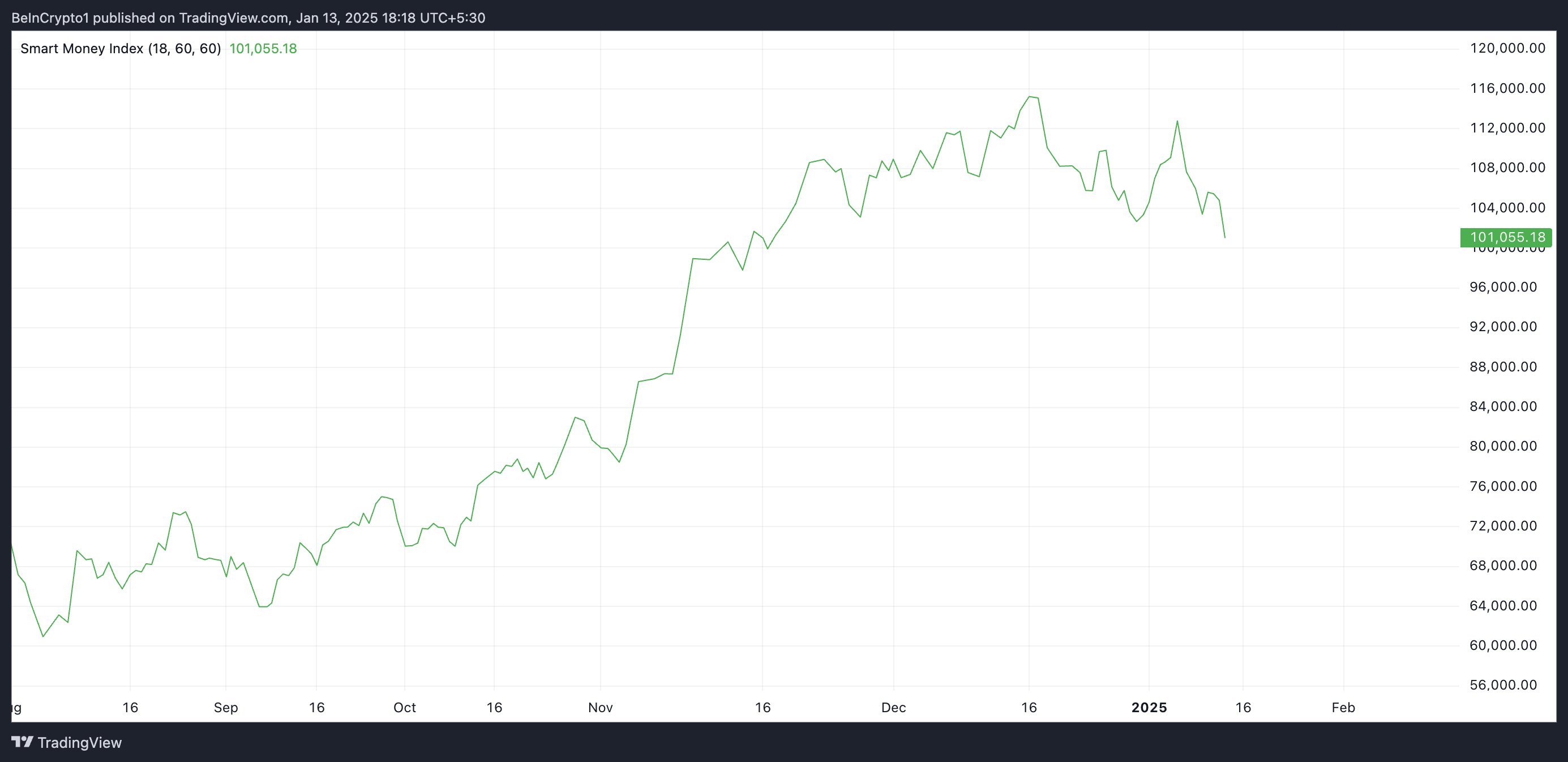 I tillegg har BTCs Smart Money Index (SMI) vedvarende falt siden 6. januar. I skrivende stund er indikatoren på 101 055, en nedgang på 10 % siden da.