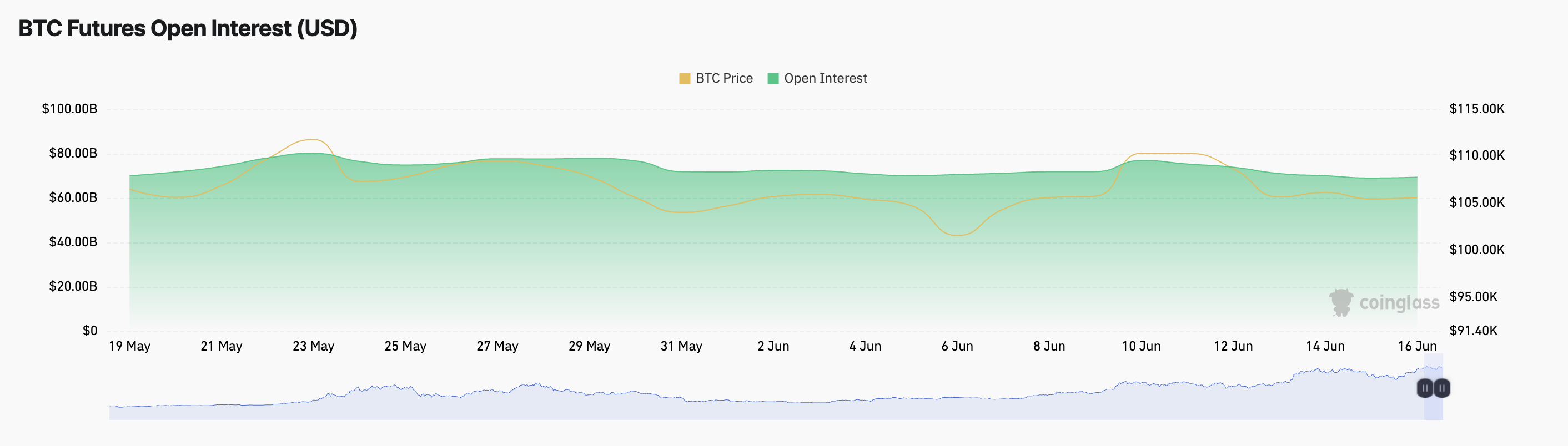 Imidlertid antyder myntens jevnt synkende futures åpen interesse at tradere forblir forsiktige, og søker tryggere grunn. Ifølge Coinglass står dette på $ 69,39 milliarder, og har stupt nesten 10 % siden 10. juni.