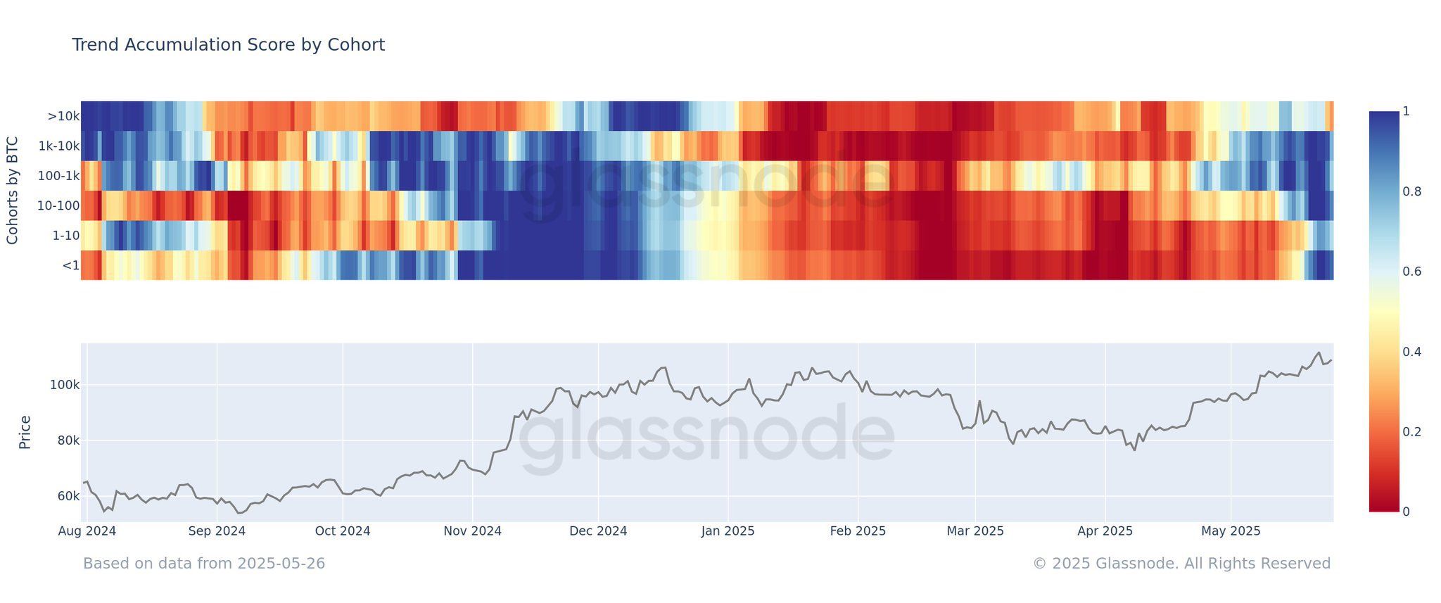 Glassnode-data bekrefter denne trenden. I mai falt akkumuleringstallet for lommebøker som holder over 10 000 BTC fra rundt 0,8 til under 0,5. Dette skiftet er visuelt representert ved en fargeendring fra blått til oransje.