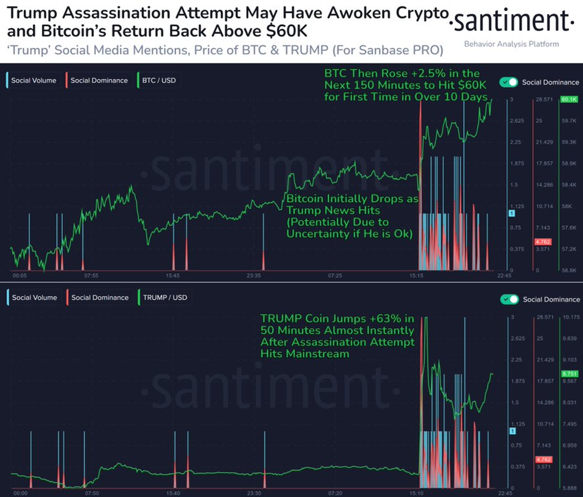 Bloookjede-etterretningsplattformen Santiment tilskrev oppgangen til et bullish sentiment rundt den amerikanske presidentkandidaten i 2024. Firmaet bemerket at kryptosamfunnet har vist positive reaksjoner på nyhetene om attentatforsøket på grunn av Trumps nylige gunstige kommentarer om kryptoindustrien. Denne hendelsen oppfattes som pro-Trump-nyheter, noe som fører til den bullish responsen.