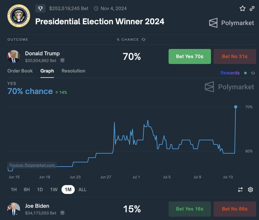 Interessant nok viser Polymarkets-data at skytingen forbedret sjansene hans for å vinne. Ifølge plattformen tror kryptospillere at Trump har 70 prosent sjanse til å vinne valget sammenlignet med president Joe Biden, hvis sjanser har falt til 15 prosent.