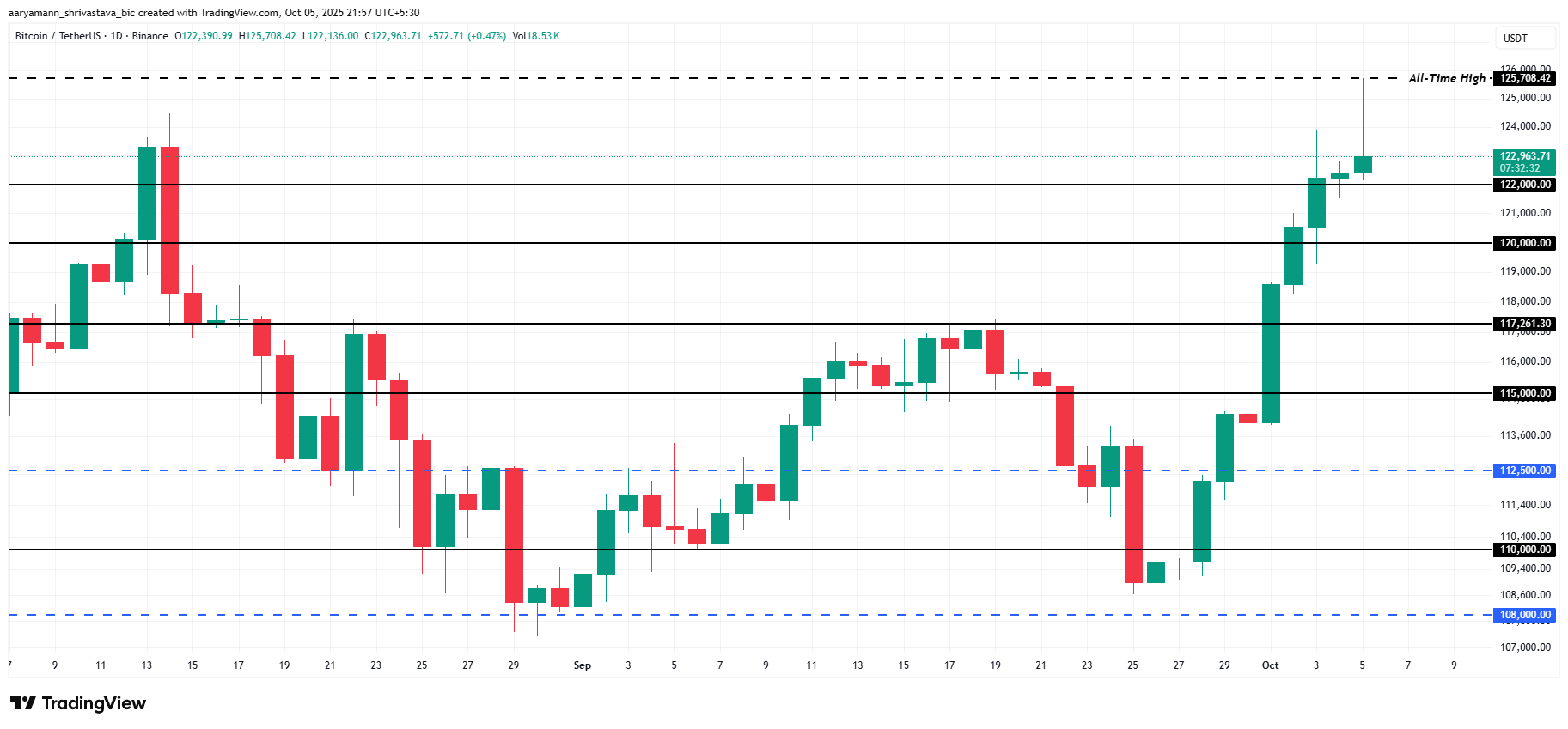 Bitcoins pris nådde en ny rekord på $ 125 708 før den konsoliderte seg nær $ 122 963. Denne tilbaketrekningen virker sunn gitt omfanget av de nylige gevinstene. Å holde seg over $ 122 000 er avgjørende for å opprettholde momentumet.