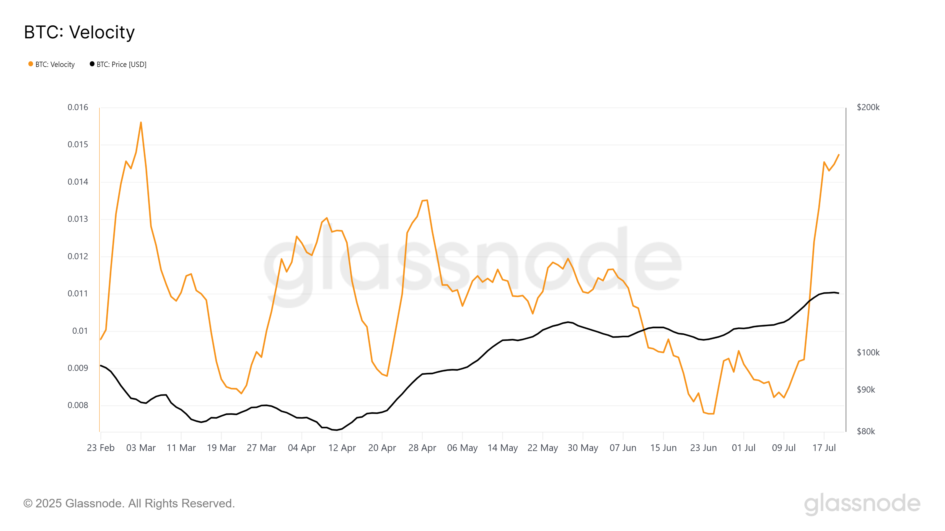 Velocity, en annen nøkkelindikator, stiger også og ligger for øyeblikket på et 4-måneders høydepunkt. Denne målingen sporer hastigheten som Bitcoin skifter hender innenfor nettverket. Høyere velocity følger vanligvis med økt handelsaktivitet, noe som reflekterer investorers forsøk på å utnytte kortsiktige bevegelser.