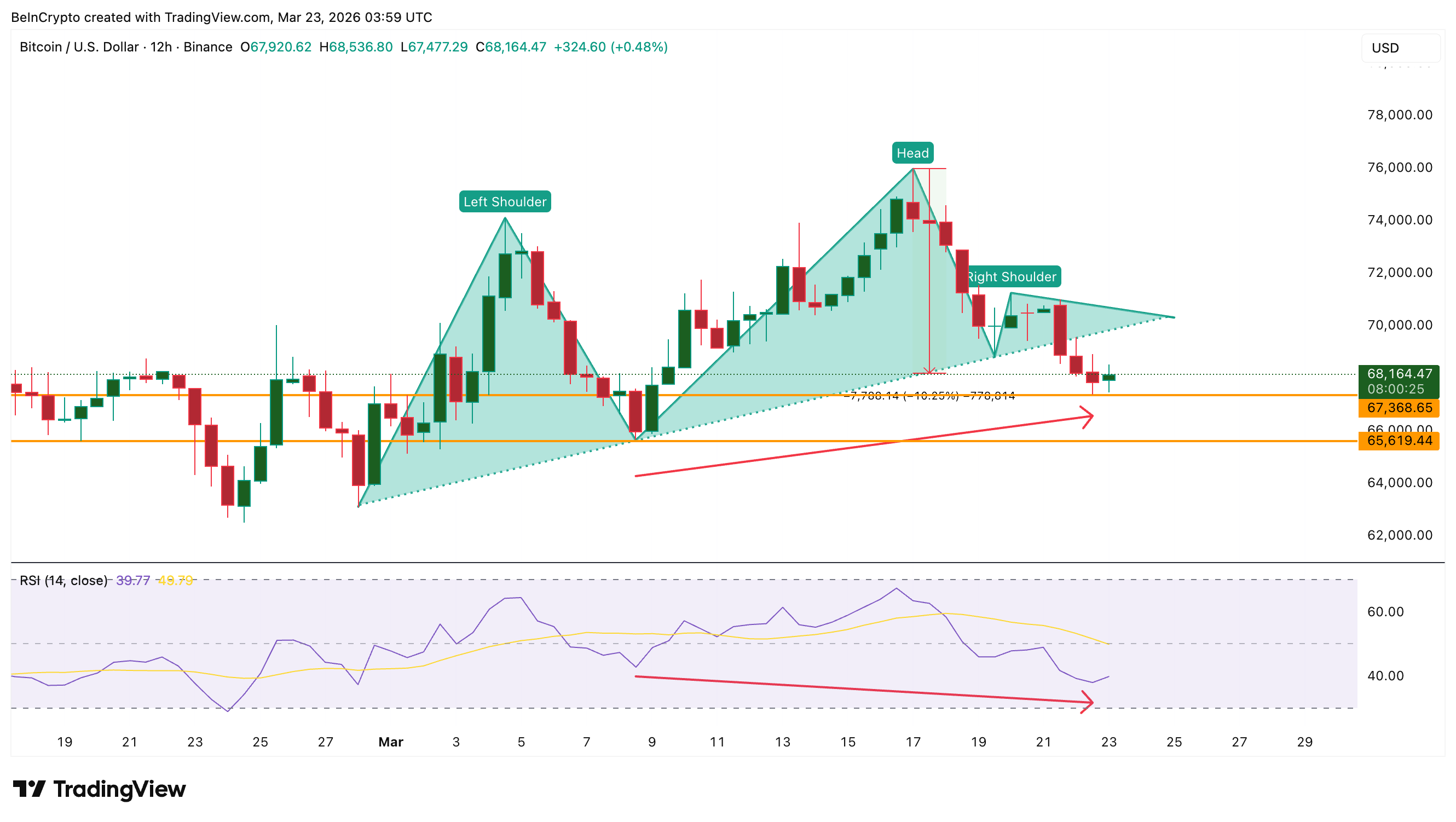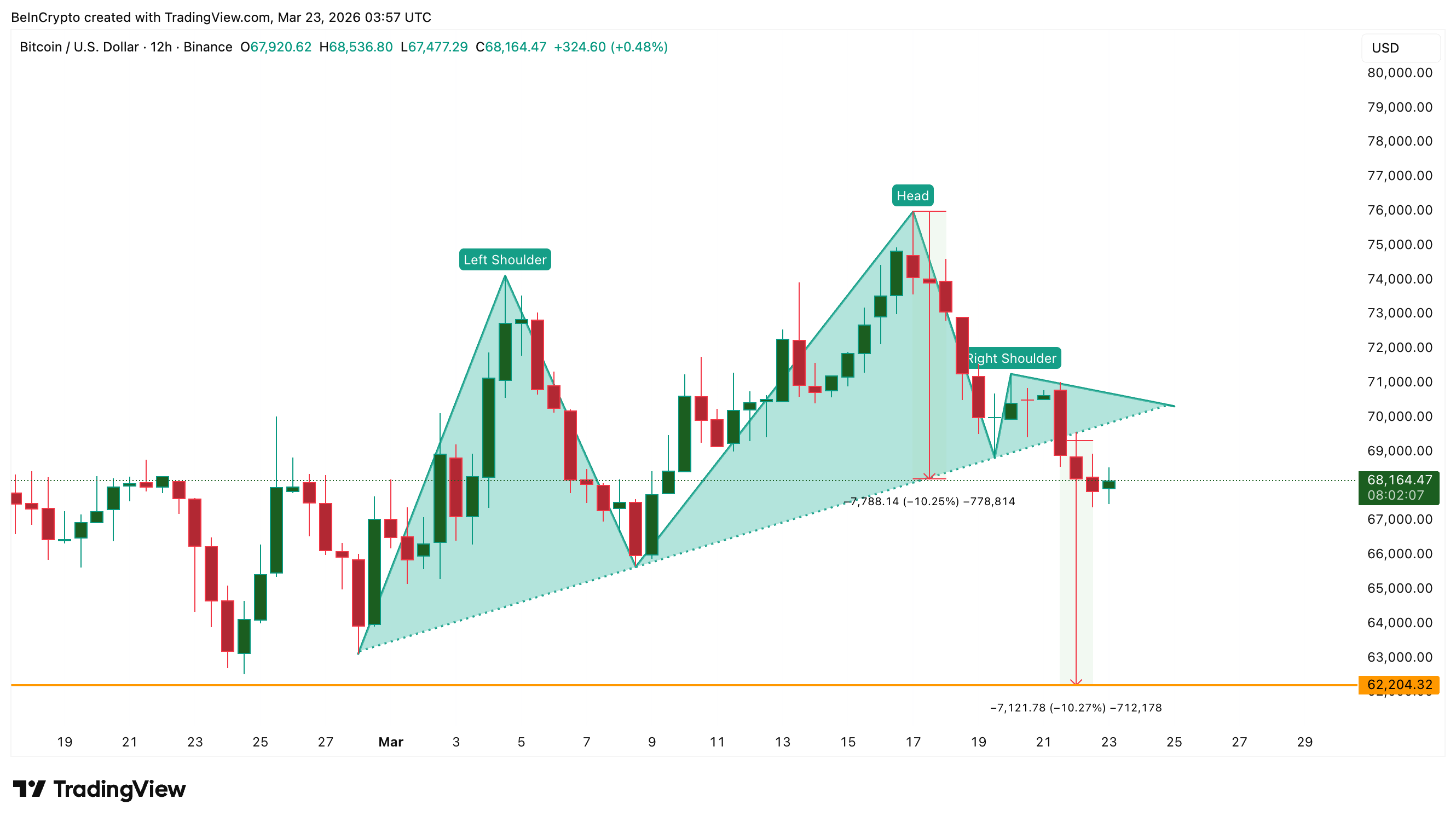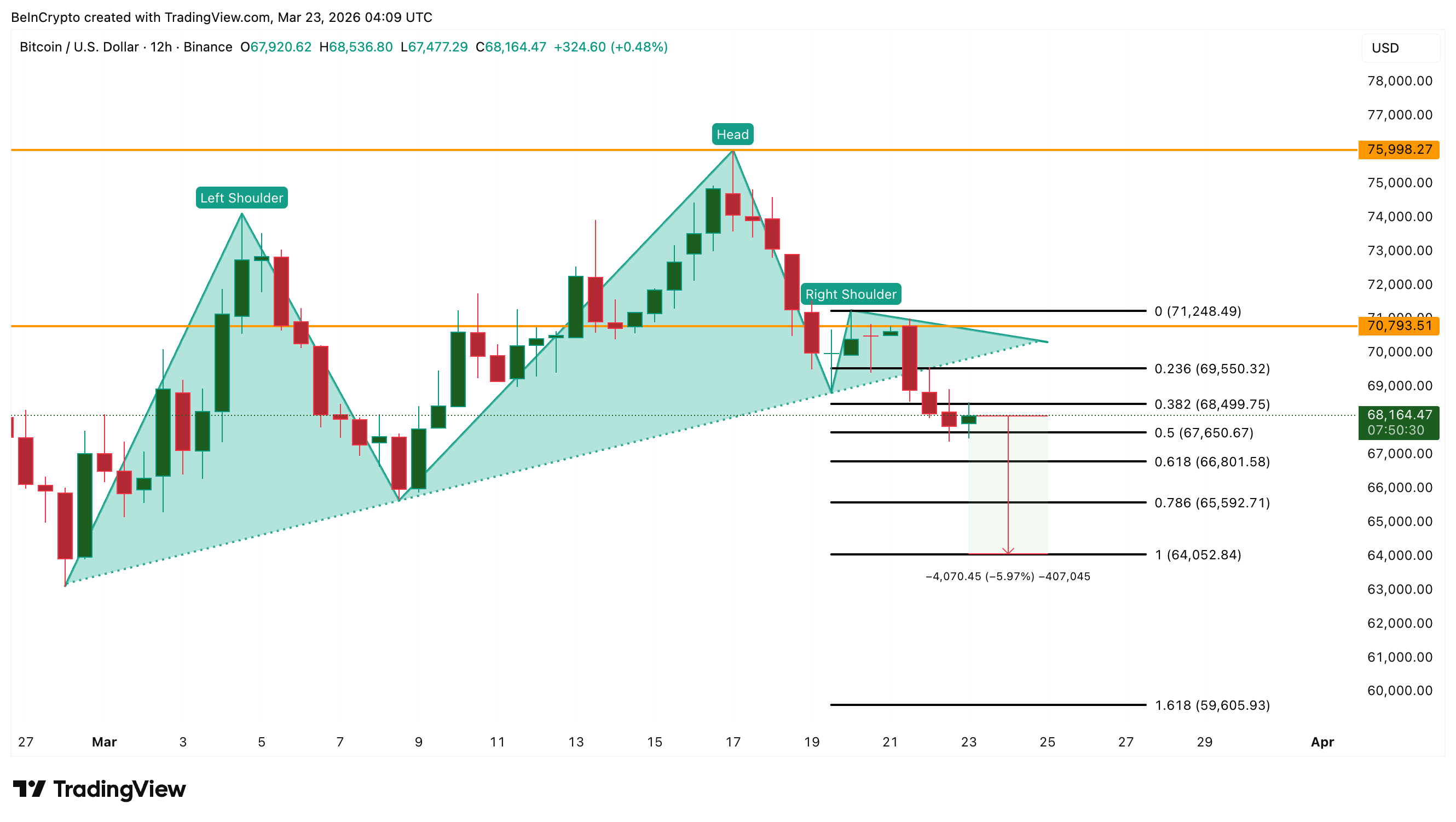 Bitcoin (BTC) kurs falt med 6 % den siste uken og handles nå nær $ 68 100 etter å ha brutt et hode-og-skuldre støttenivå 21. mars.