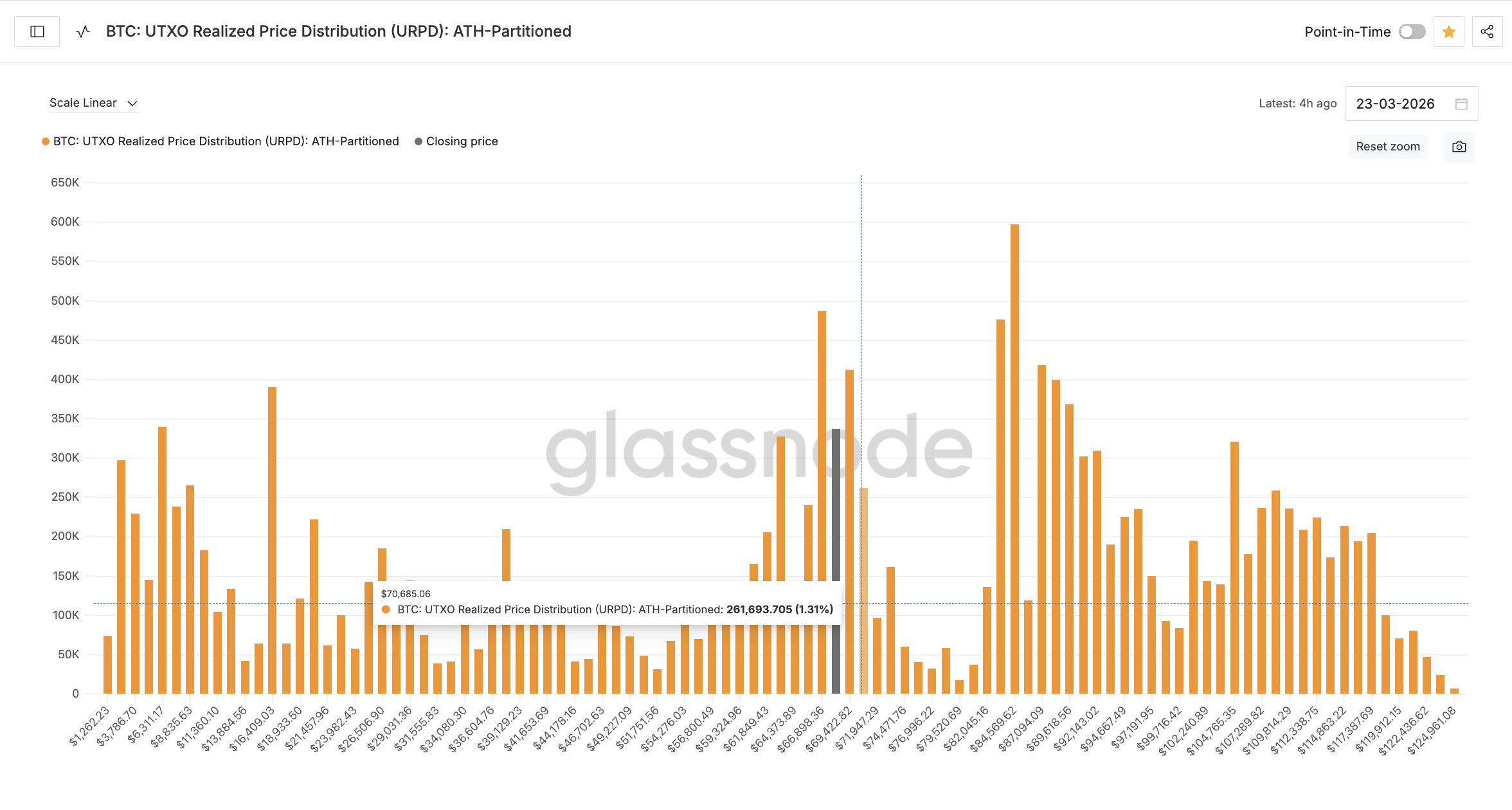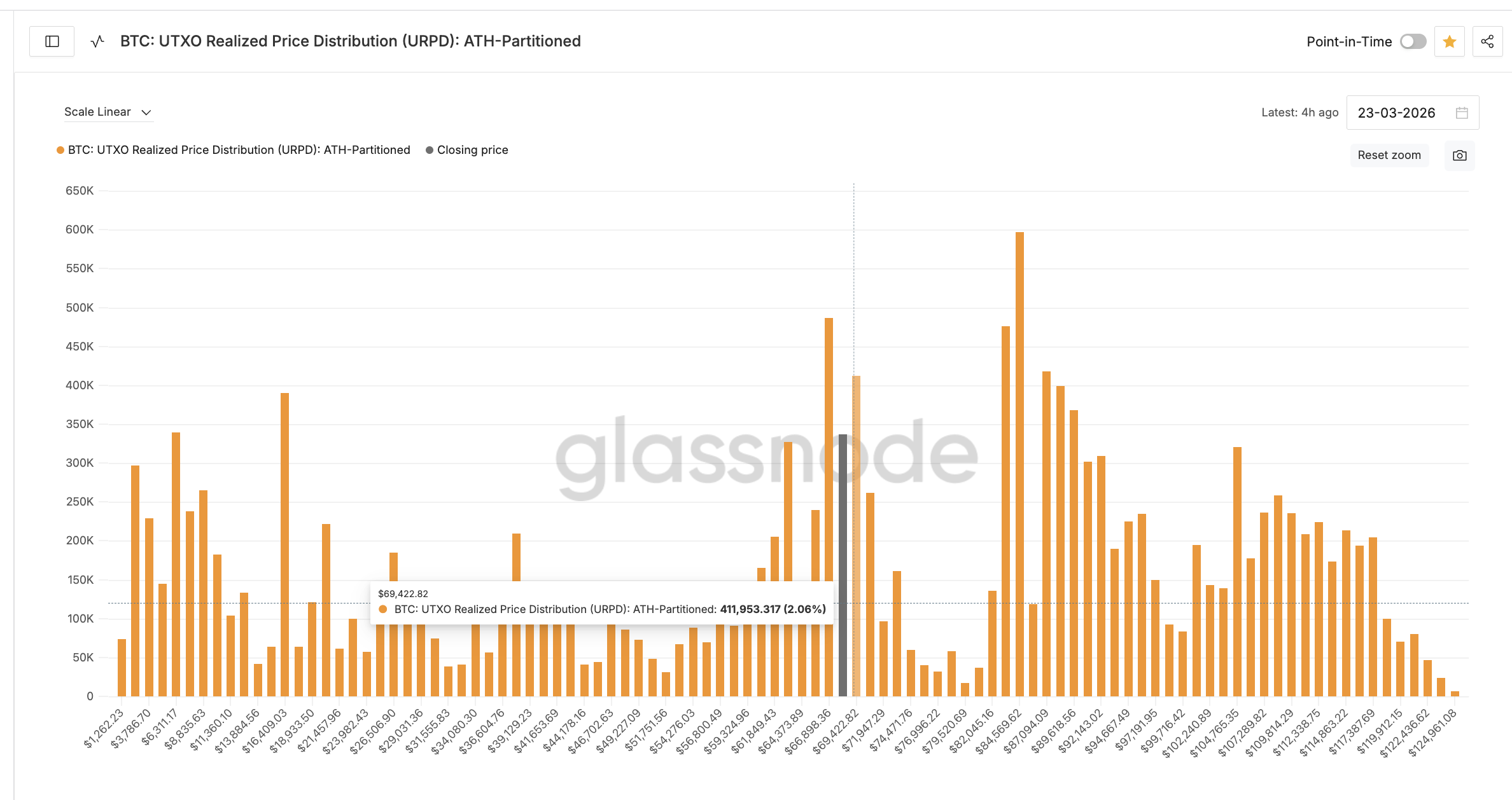 UTXO Realized Price Distribution (URPD), en måling som viser hvor Bitcoin-tilbudet sist flyttet seg on-chain, avslører to tette klynger rett over nåværende kurs. På $ 69 400 byttet cirka 411 953 BTC (2,06 % av total forsyning) sist eiere. Rett over der, på $ 70 600, ligger ytterligere 261 694 BTC (1,31 %) konsentrert.