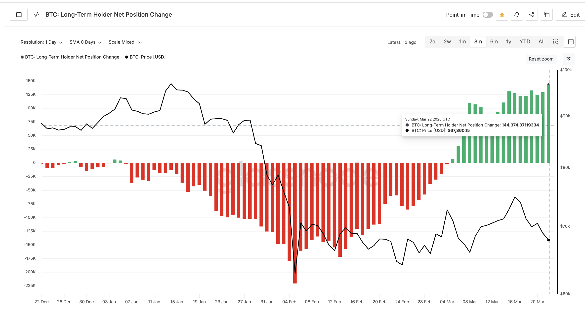 Langsiktige innehavere, altså de som har holdt i over 365 dager, følger samme mønster. Daglig netto posisjonsendring for denne gruppen ble positiv tidlig i mars og økte til 144 374 BTC per 22. mars, opp fra 129 262 BTC 21. mars. Dette tilsvarer nesten 12 % økning i akkumulering.