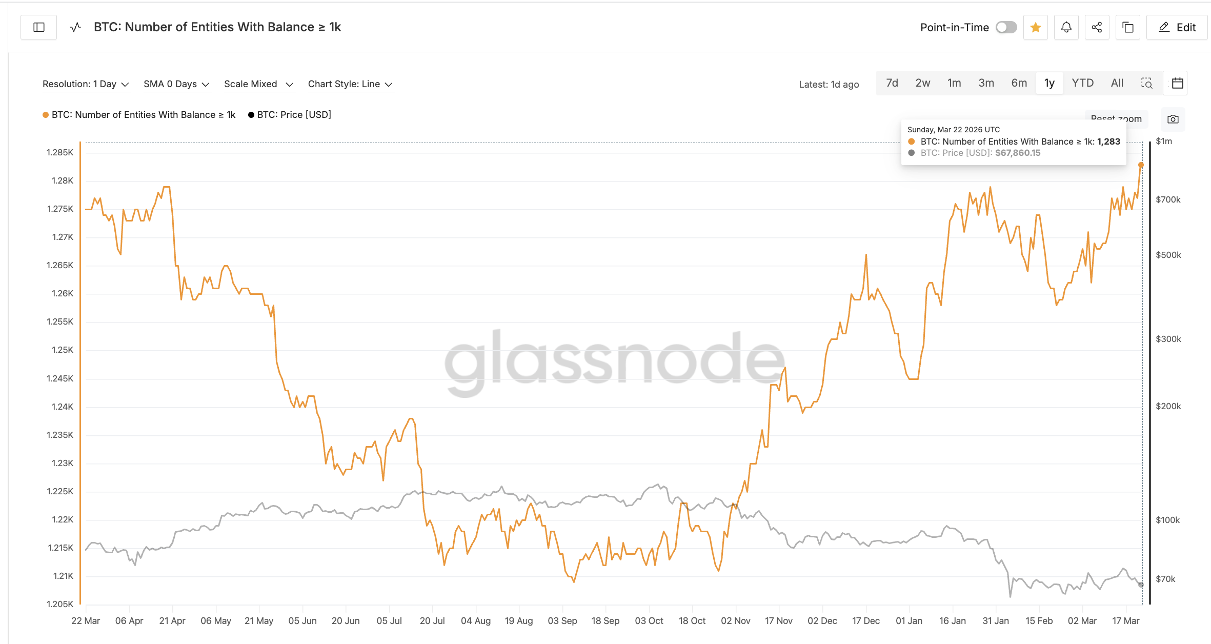 Til tross for nedgangen, fyller Bitcoin-hvaler på med flere posisjoner fremfor å selge seg ut. Antall enheter som holder minst 1000 BTC steg til 1283 per 22. mars, ifølge Glassnode-data. Dette er høyeste nivå på ett år. Oppgangen har vært jevn siden starten av mars, men akselererte etter støttelinjen brøt 21. mars, da tallet steg fra rundt 1277 til 1283. Dette tilsvarer minst cirka 6000 BTC som er lagt til på to dager. Liten, men viktig økning som viser optimisme blant hvalene.