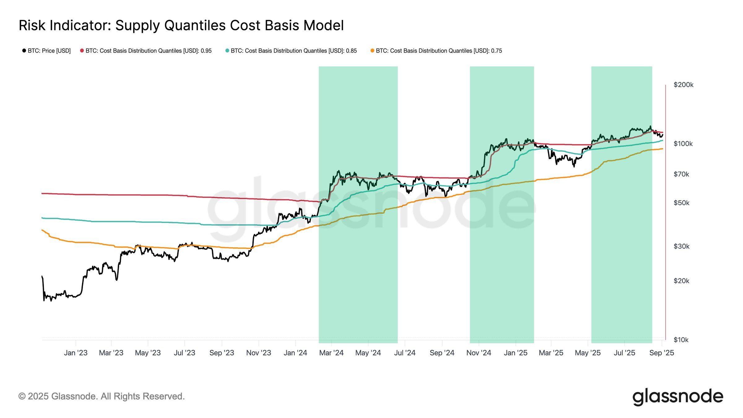 Risikoindikatoren for forsyningskvantiler fremhever denne utviklingen. Bitcoins rally i midten av august til nye høyder markerte den tredje fler-måneders euforiske fasen i denne syklusen, definert av økende momentum som plasserte nesten all forsyning i profitt. Denne oppførselen gjenspeiles av 0,95 kvantil kostnadsgrunnlag, hvor 95 % av forsyningen har urealiserte gevinster.