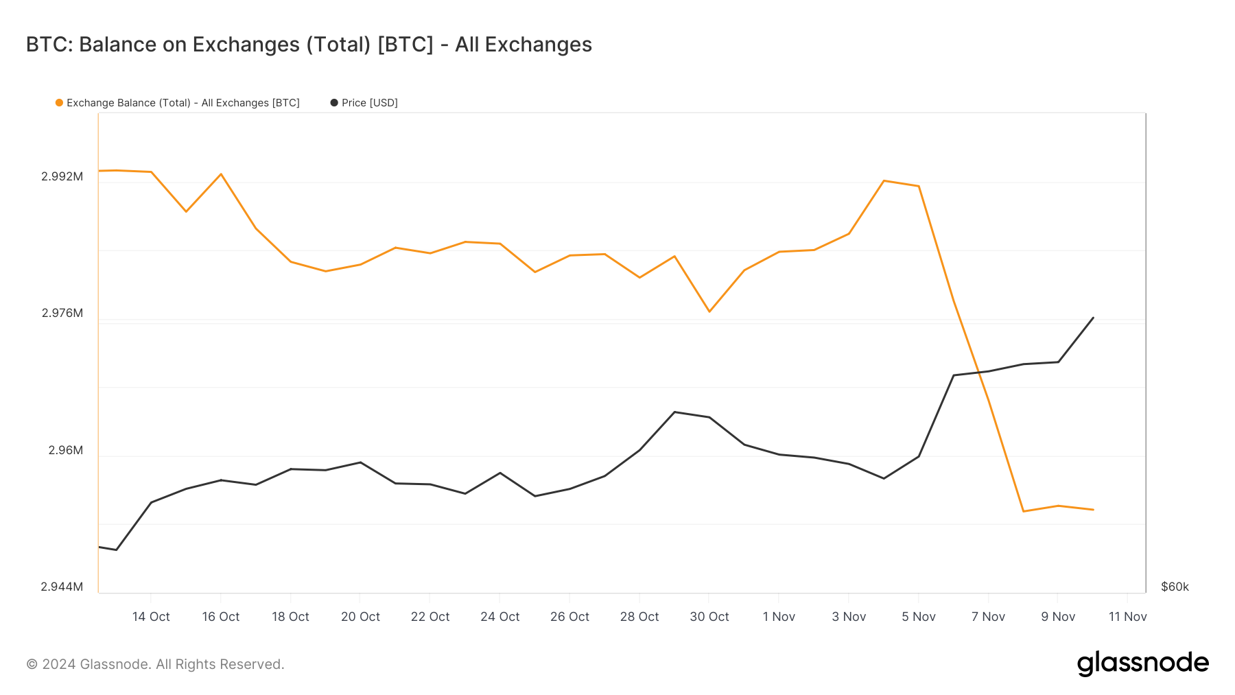 Når den øker, betyr det at mange innehavere er forberedt på å selge, noe som kan føre til et nedtrekk. Basert på dataene ovenfor har Bitcoin-innehavere trukket tilbake nesten 40 000 BTC fra børser siden 5. november.