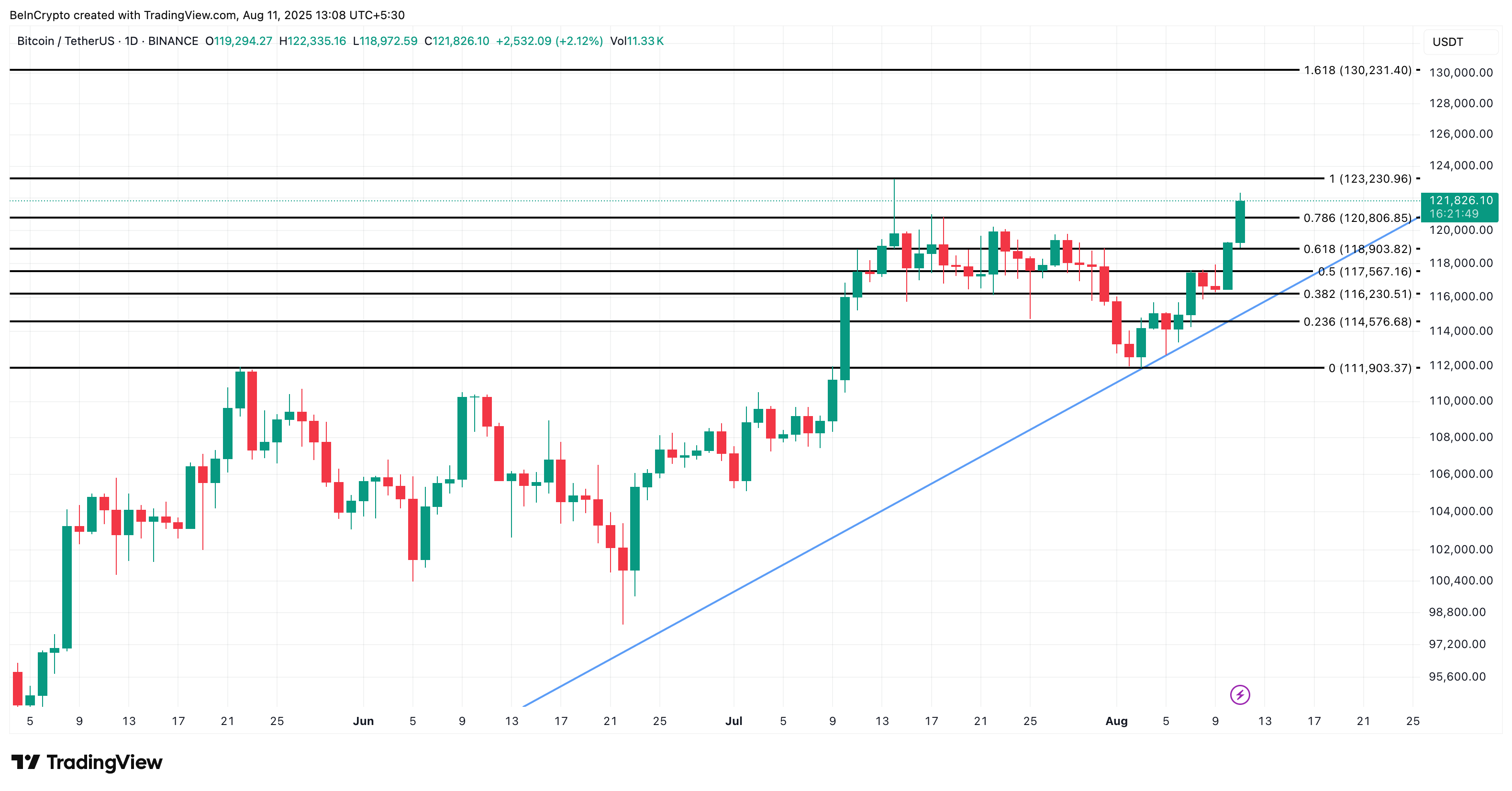 På det daglige diagrammet beveger Bitcoin seg fortsatt innenfor en veldefinert stigende kanal. Prisen presser mot $123 230 Fibonacci 1,0-nivået; det samme området som begrenset oppgangen 14. juli. Et klart brudd her kan sikte mot $130 231.