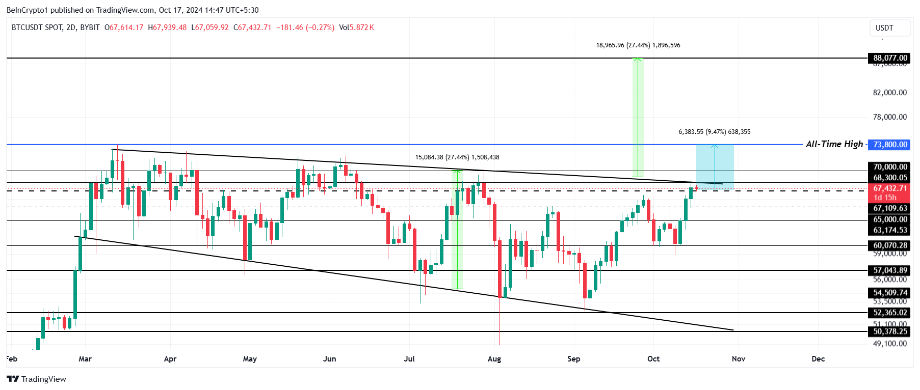 Bitcoin handles for øyeblikket til $ 67 432, og nærmer seg det kritiske motstandsnivået på $ 68 000. I tillegg står Bitcoin på randen av å bryte ut av et synkende kilemønster som har vært i spill siden mars. Et brudd på dette mønsteret kan føre til en oppgang på opptil 27 %, potensielt dytte prisen opp til $ 88 077.