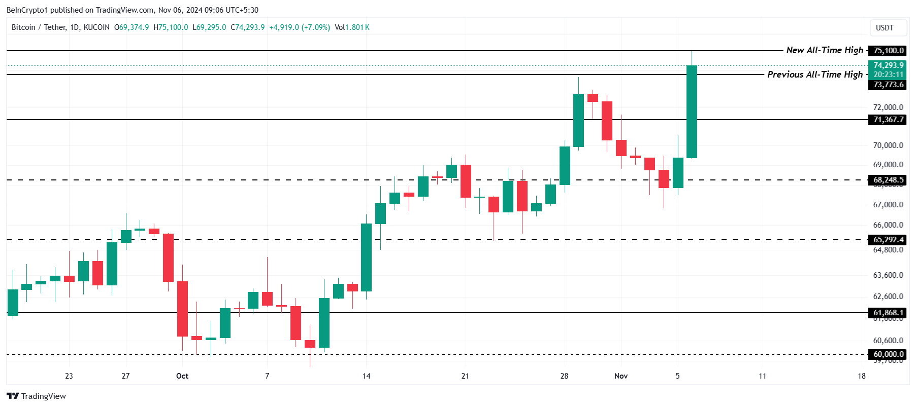En brattere tilbakegang kunne imidlertid viske ut dagens gevinster. Likevel er Bitcoins nye historiske høyde på $ 75 100 nå etablert.