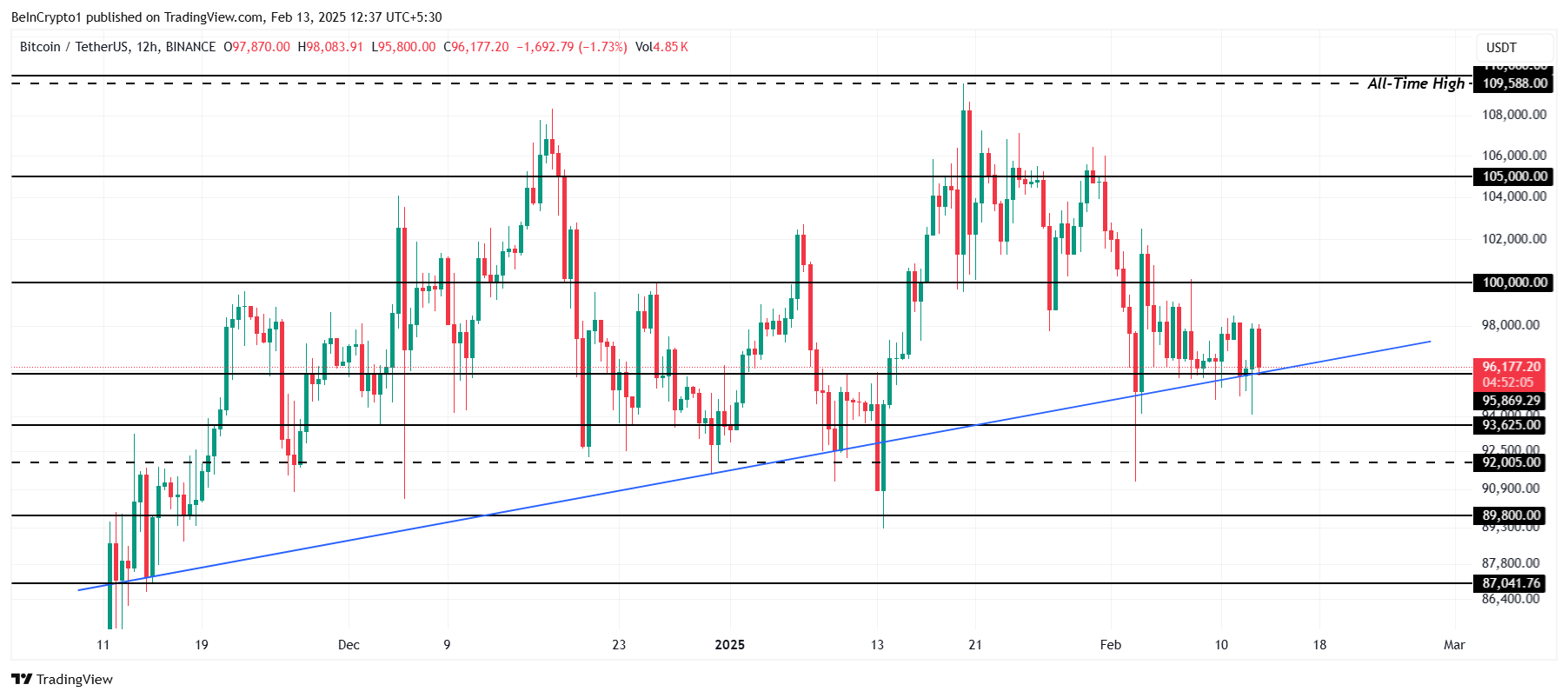 Men hvis Bitcoin mister støttenivået på $ 95 869, kan den falle under sin oppadgående linje og se en nedgang til $ 93 625 eller lavere. En slik bevegelse vil ugyldiggjøre den nåværende bullish tesen, signalisere et potensielt skifte i markedsstemningen og muligens forsinke ytterligere gevinster for Bitcoin.