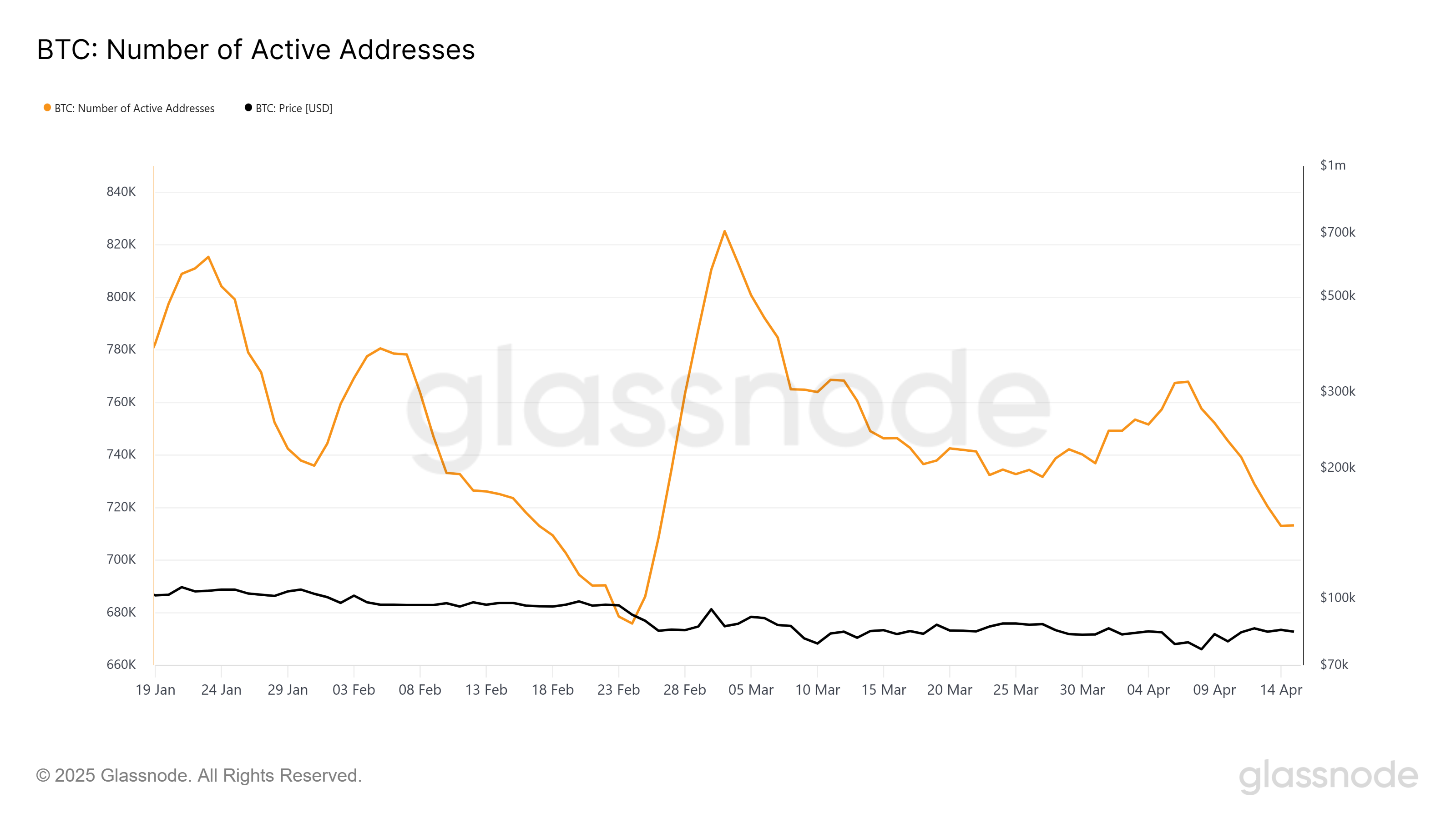 Den overordnede makro-momentumet til Bitcoin peker også på nøling blant markedsdeltakere. Aktive adresser på Bitcoin-nettverket er på et nesten to måneders lavpunkt, noe som antyder redusert engasjement.