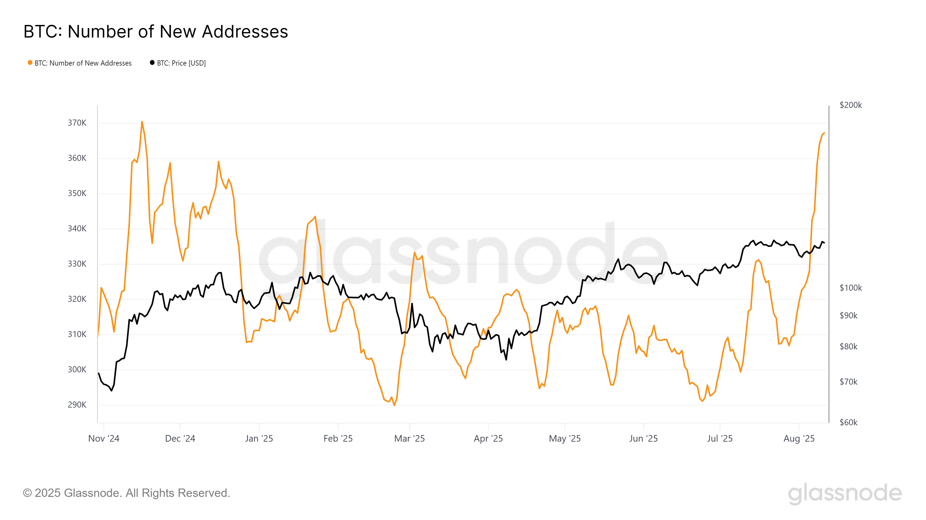 Bitcoin nyter for tiden også økende interesse, med nye adresser som har økt med 15 % de siste ti dagene. Antall aktive adresser har steget til 367 349, noe som markerer en 9-måneders høyde.