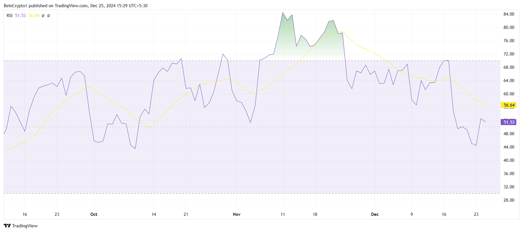 En fallende RSI antyder at Bitcoin risikerer å miste sitt oppadgående momentum. Hvis denne trenden fortsetter, kan det ytterligere dempe markedsoptimismen og presse prisene lavere. Tradere og investorer overvåker nøye RSI for tegn på en potensiell reversering eller fortsatt nedgang.
