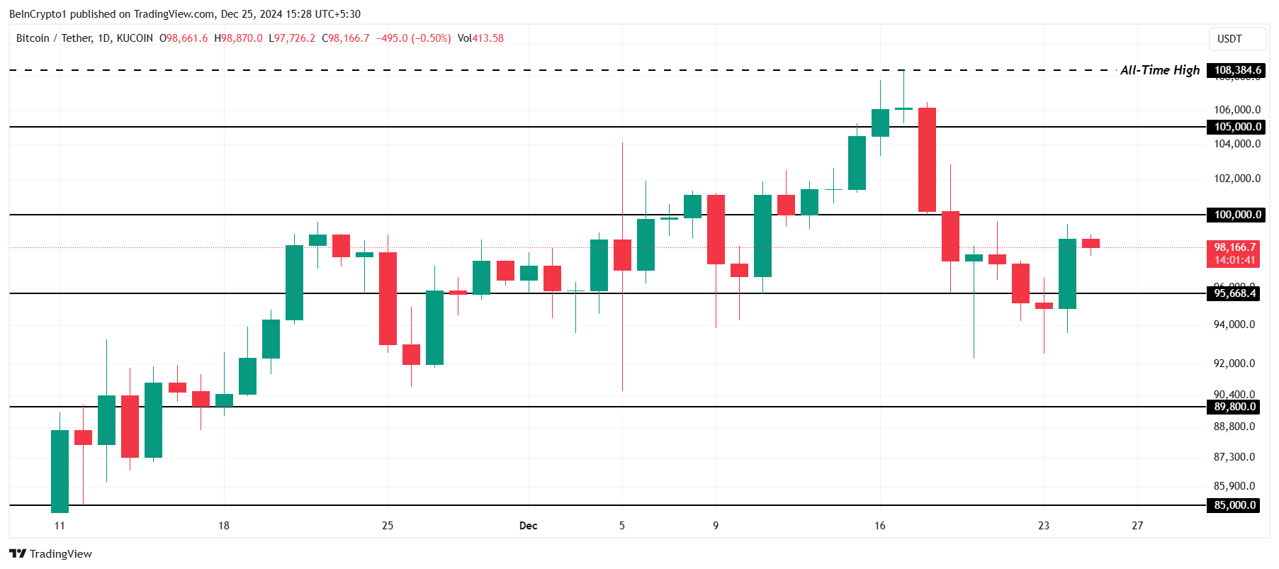På nedsiden antyder de nevnte bearish faktorene at Bitcoin kan falle til $ 95 668. Å miste dette viktige støttenivået kan åpne dørene for en dypere nedgang, med $ 89 800 som et potensielt mål. Dette scenariet vil markere et betydelig tilbakeslag for BTC-investorer.