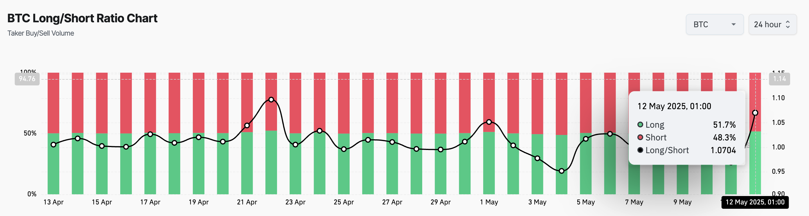 For eksempel reflekterer myntens Long/Short Ratio den bullish biasen mot den i futuresmarkedet. Ved pressemelding står denne på 1,07.