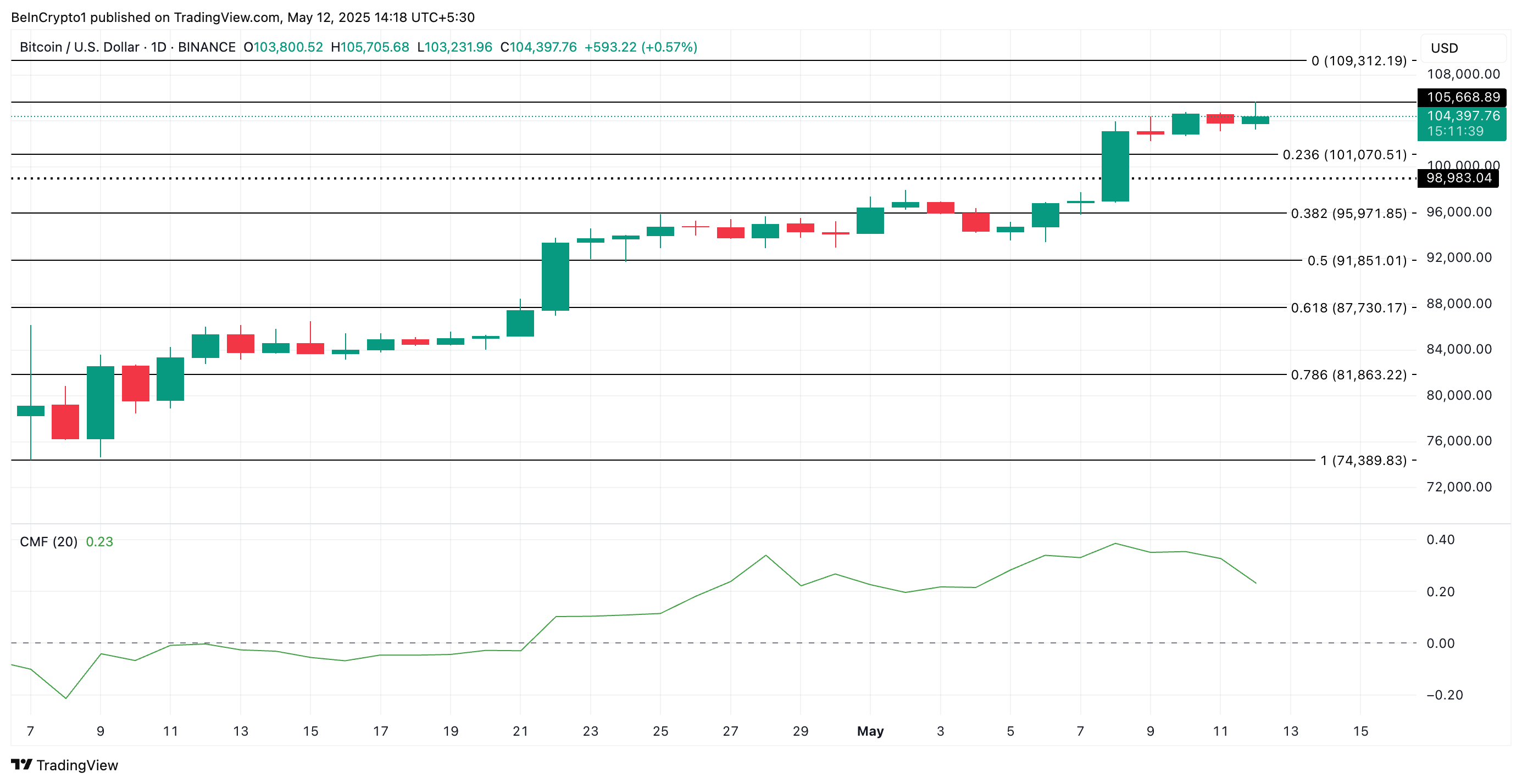 Denne økningen i bullish derivataktivitet reflekterer ofte en bredere forventning om stigende priser blant BTC-investorer. Hvis kjøpspresset opprettholdes, kan mynten klatre tilbake over $ 105 000. Hvis det potensielle støttenivået på $ 105 668 holder, kan det presse BTC mot sin all-time high på $ 109 312.