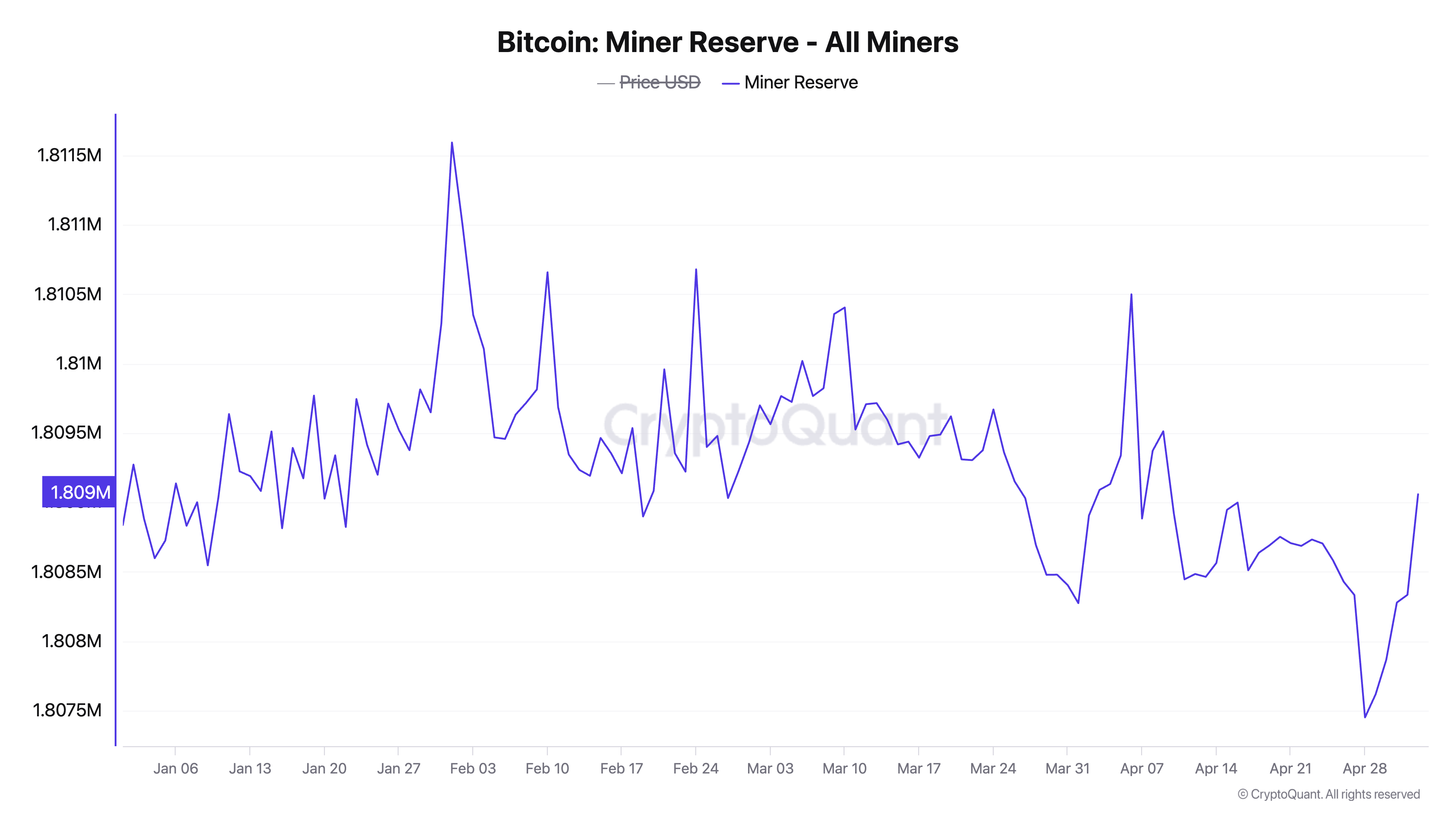I følge CryptoQuant begynte Bitcoins minereserve, som hadde vært i en vedvarende nedadgående trend, å stige 29. april, kort tid etter at BTC stengte over $ 95 000-grensen.