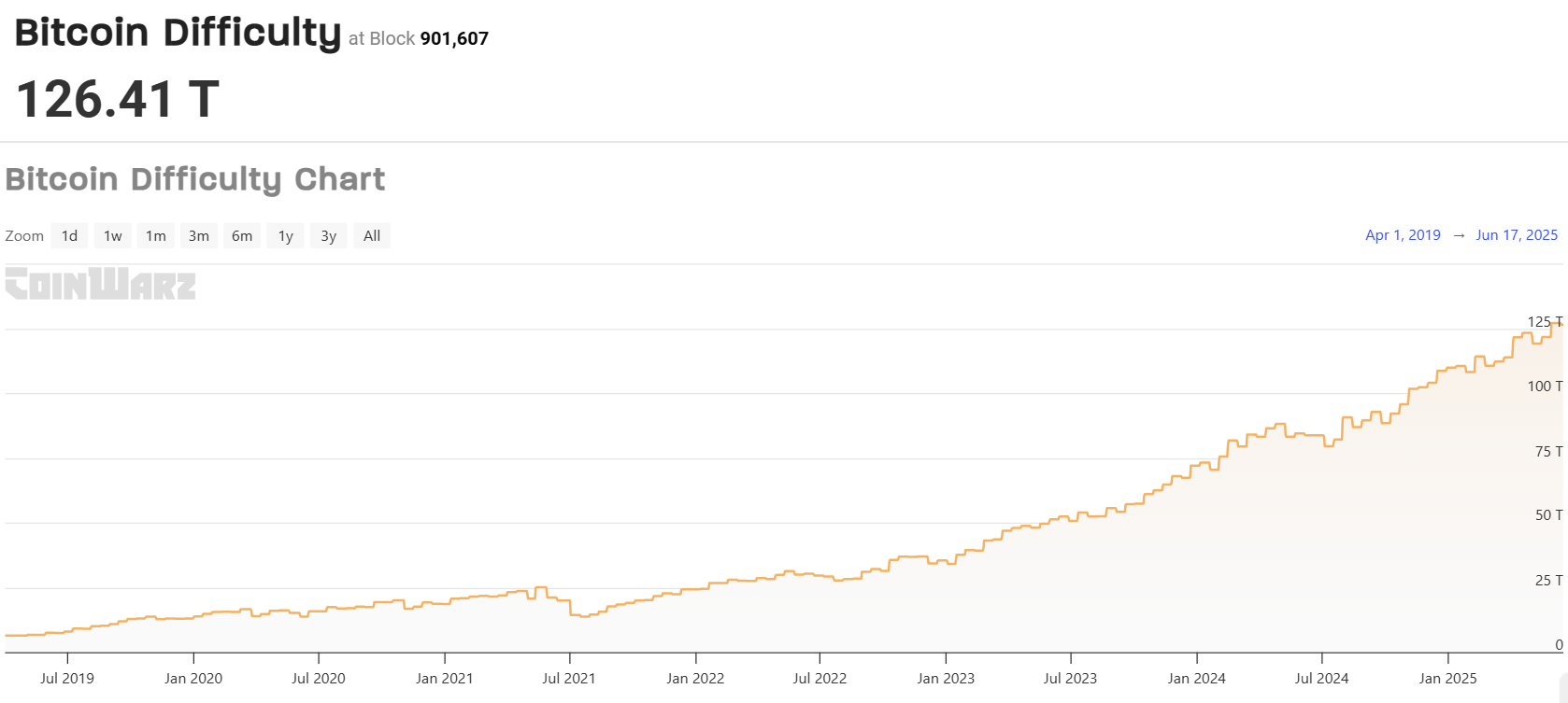 TheMinerMag bemerket at Bitcoins mining-vanskelighet har oversteget 126 billioner. Data fra Coinwarz støtter dette, med grafer som viser en kraftig økning de siste årene.
