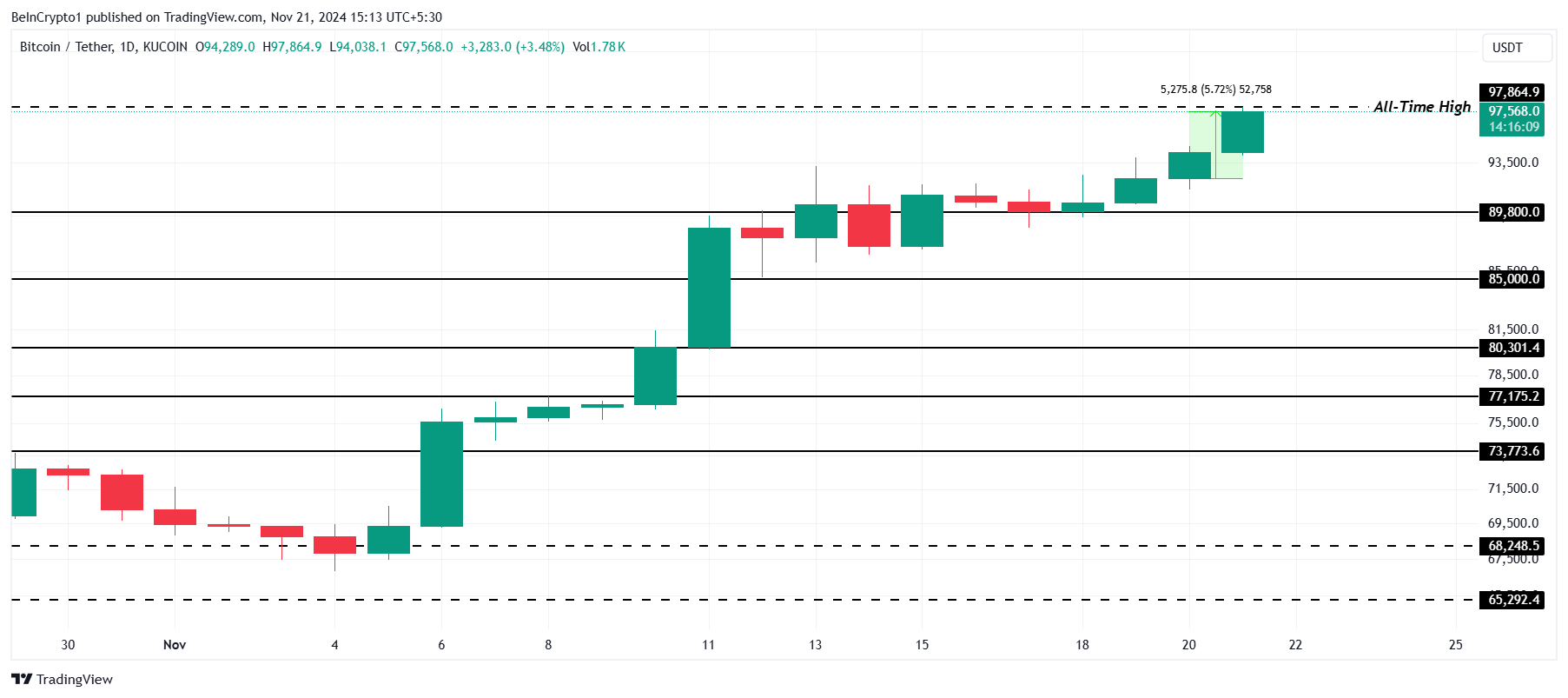 For å nå $ 100 000, må Bitcoin opprettholde sitt bullish momentum og etablere $ 97 864 som et nytt støttenivå. En vellykket omgjøring av denne motstanden til støtte, kombinert med hvalakkumulering og LTH-overbevisning, kan drive Bitcoin til sin historiske milepæl.