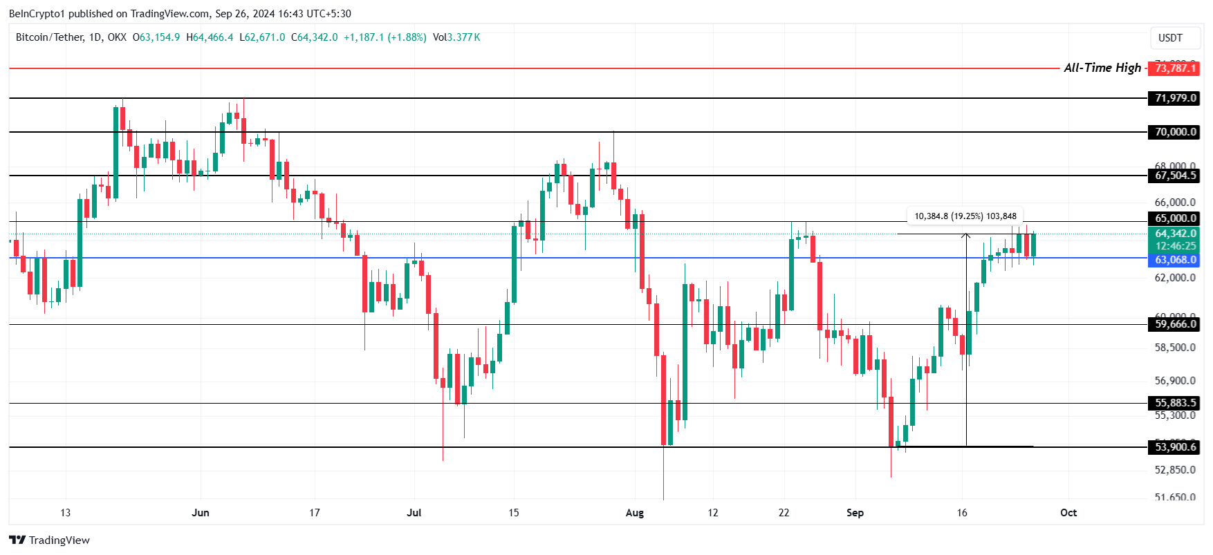 Bitcoin kursen har økt med 19 % de siste dagene, og har nådd $ 64 342. Til tross for denne betydelige økningen, møter kryptovalutaen motstand ved $ 65 000.