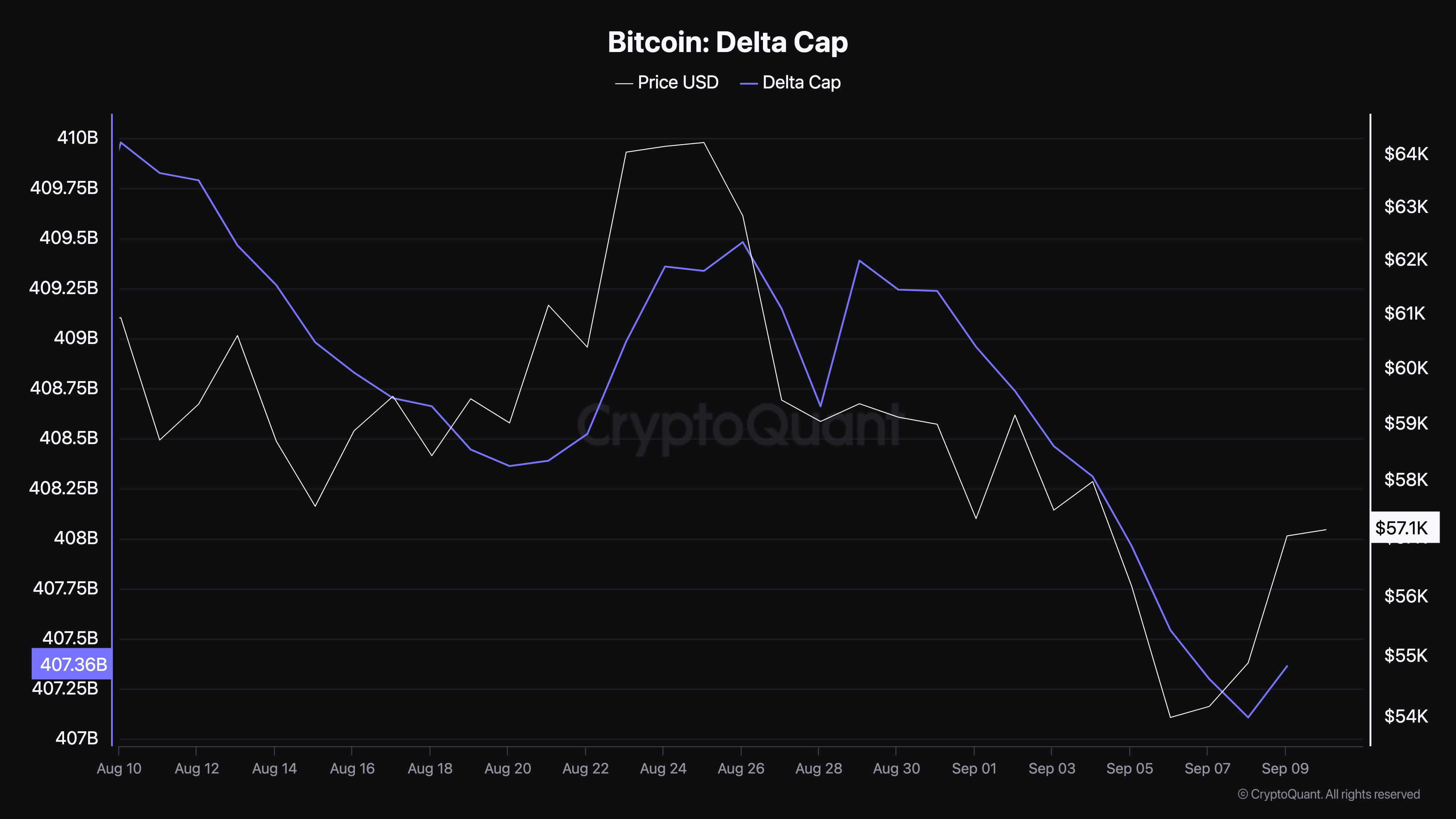 For øyeblikket står Bitcoins Delta Cap på $ 407,36 milliarder, mens Realized Cap er $ 621,35 milliarder. Det betydelige gapet mellom disse målingene antyder at det kan ta en stund før BTC går inn i en vedvarende oppadgående trend.