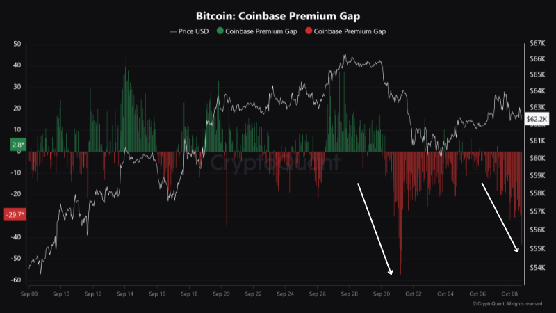 Coinbase Premium-indeksen, en målestokk som sporer prisforskjellen på Bitcoin mellom Coinbase og Binance, har holdt seg i negativt territorium så langt i oktober. Coinbase, en av de ledende kryptobørsene i USA, er en viktig plattform for institusjonelle investorer for å handle kryptovalutaer.