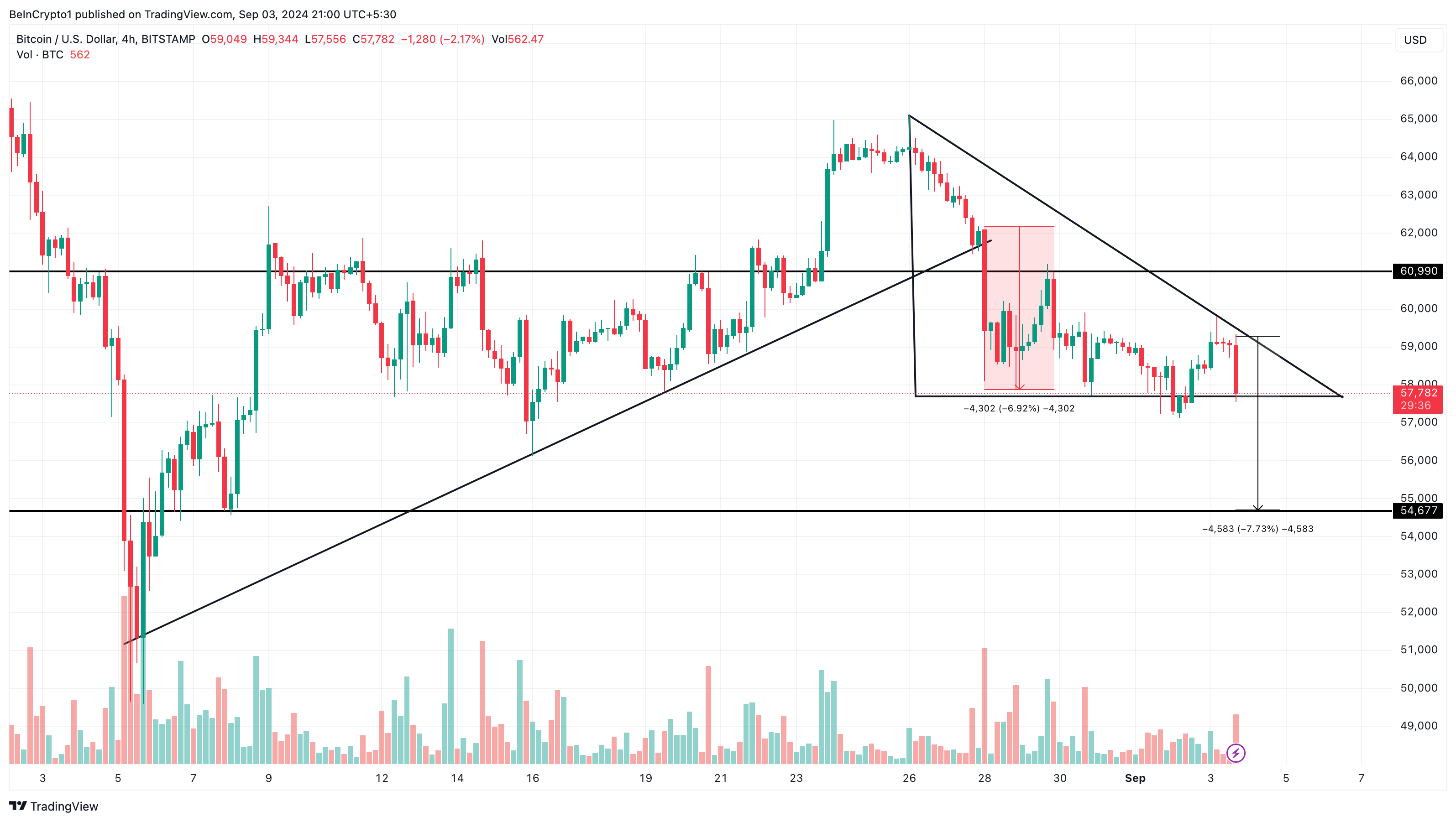 Fra et teknisk synspunkt avslører Bitcoins 4-timers diagram dannelsen av en synkende trekant, et bearish mønster som ofte signaliserer fortsettelsen av en nedadgående trend. Tidligere hadde Bitcoin dannet en stigende trekant, som kunne ha indikert en oppsving, men det bullish scenariet ble ugyldiggjort da prisen stupte fra $ 62 000.