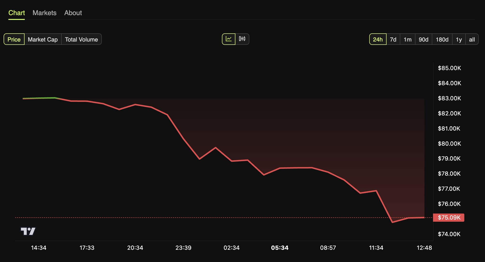 Uken åpnet med en dyster tone for kryptovalutamarkedet, med mange som refererer til det som en “Black Monday.” I følge BeInCrypto-data opplevde Bitcoin en kraftig nedgang på 9,6 % de siste 24 timene, og falt til $ 75 089 i skrivende stund.