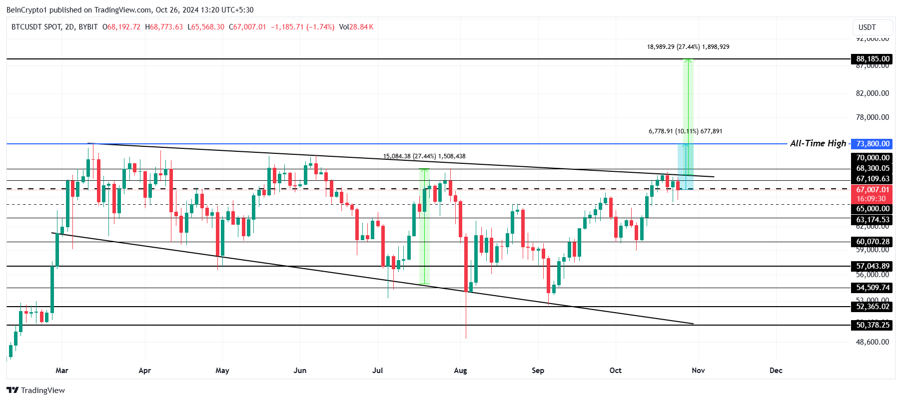 Likevel sliter Bitcoin fortsatt med å oppnå et klart gjennombrudd, noe som gjør $ 67 000 til et kritisk støttenivå. Å ikke holde dette støttenivået kan presse BTC ned til $ 65 000, potensielt forsinke det forventede gjennombruddet og utfordre det bullish synet.