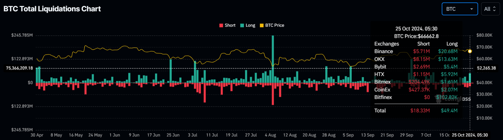 Bitcoins kurs har sett en pågående kamp for å lukke over det kritiske $ 70 000 merket, med nylige forsøk som ikke strekker til. Denne mangelen på å sikre en solid lukking har ført til et tap for long-tradere, som har opplevd betydelige likvideringer.