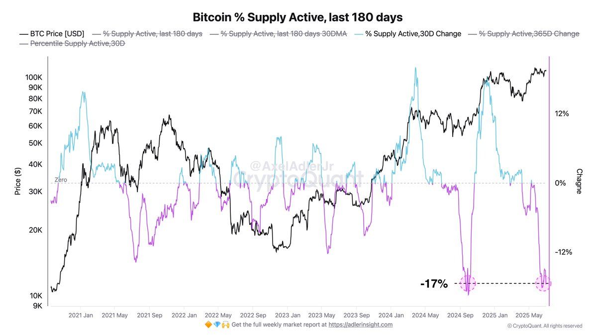 I tillegg signaliserer % Supply Active 30D Change-indeksen, som falt 17 % ifølge analytiker Axel AdlerJr Jr., akkumulering—en trend som ofte går forut for en bull run, lik tidligere sykluser.