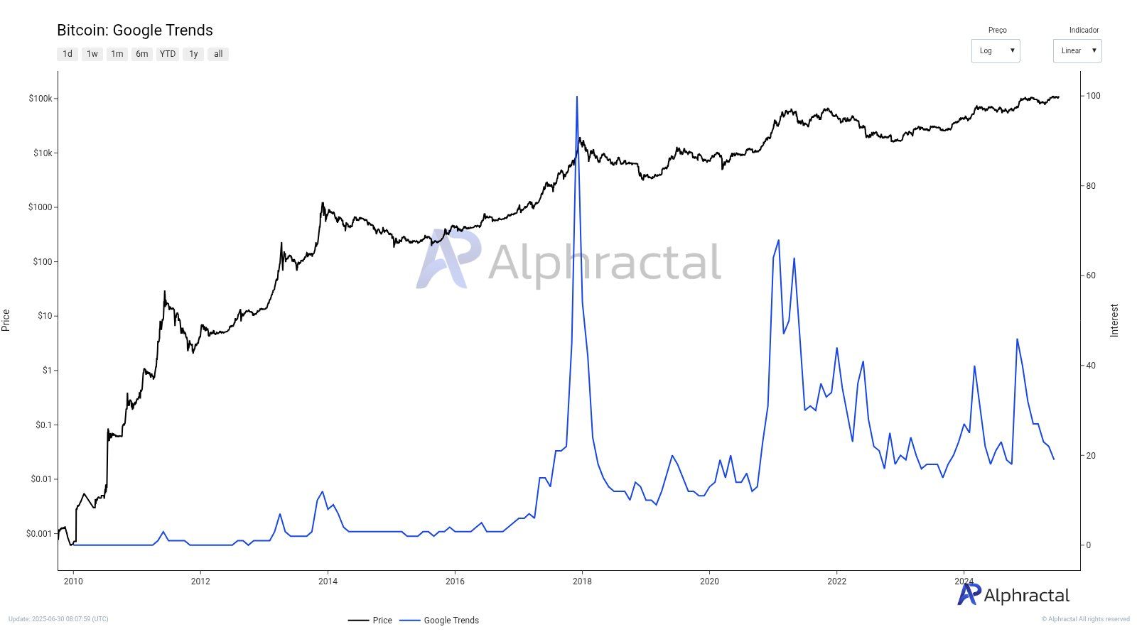 Tidligere, i slutten av april 2025, forble Bitcoin søkevolum på Google Trends lavt til tross for at BTCs pris steg forbi $ 90 000 i 2025. Endringer i informasjonsatferd og Bitcoins markedsmodenhet bidrar til fallende søkevolumer på Google.