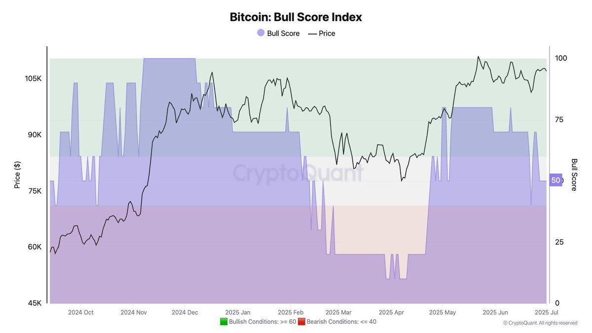 Likevel støtter ikke alle signaler en umiddelbar oppgang. Ifølge analytiker Julio Moreno står Bitcoin Bull Score for øyeblikket på 50, noe som indikerer et nøytralt marked som må overstige 60-grensen for å utløse en ekte oppgang.