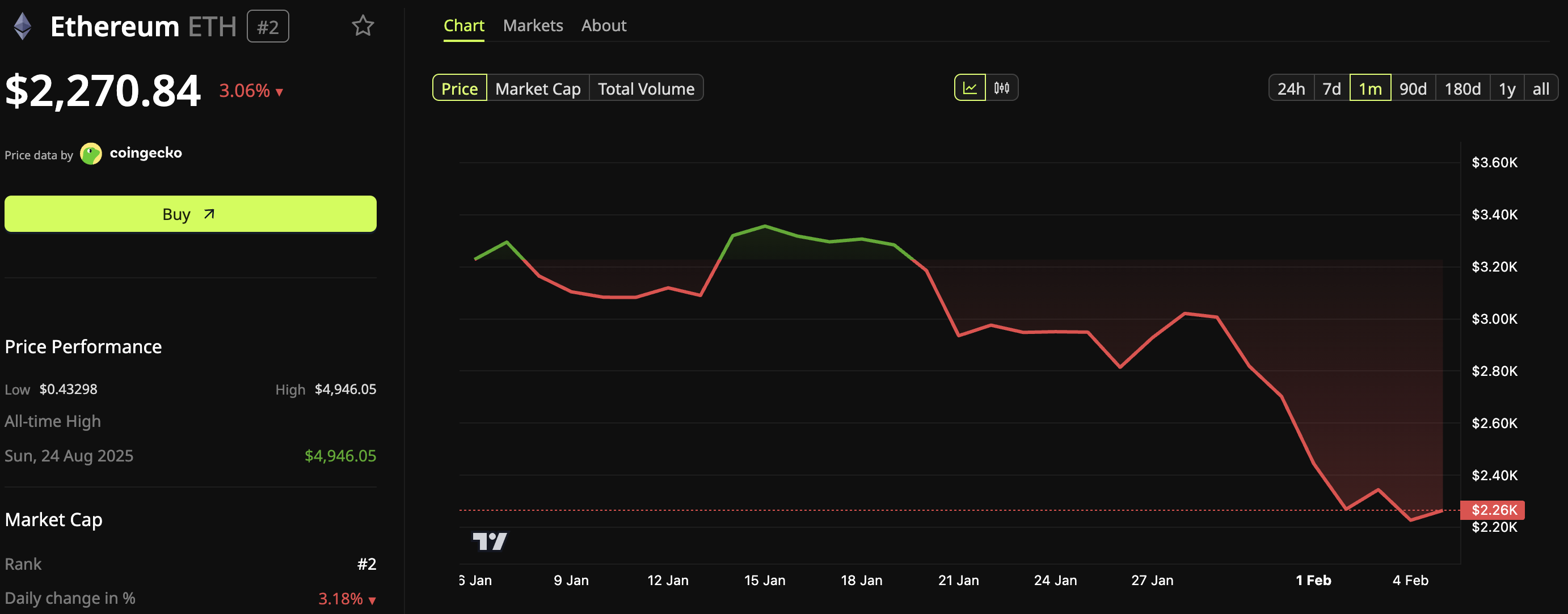 På tirsdag falt ETH kort til $ 2109 på Binance, det laveste nivået siden mai 2025. I skrivende stund handles altcoinen til $ 2270, en nedgang på 3,06 % det siste døgnet.