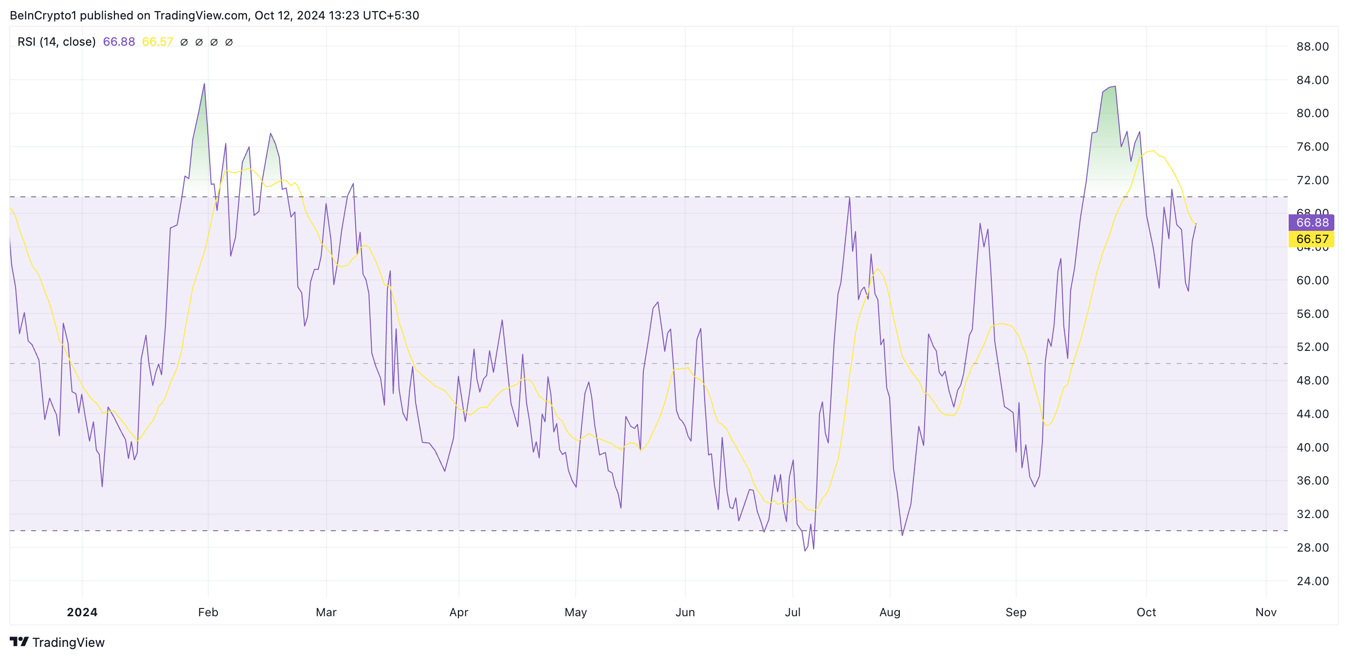 TAOs Relative Strength Index (RSI) støtter dette bullish perspektivet. I skrivende stund er TAOs RSI, som måler dens overkjøpte og oversolgte markedsforhold, i en oppadgående trend på 66,13. Denne RSI-verdien indikerer at TAOs kjøpepress er sterkt, og den opplever positiv prisbevegelse.