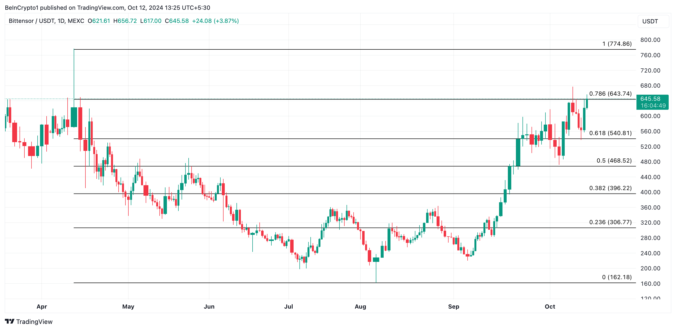 Prisen på Bittensor (TAO), en ledende kunstig intelligens-basert token, har steget dramatisk de siste ukene. Altcoinen handles for øyeblikket til $ 638,43, noe som markerer en økning på 126 % den siste måneden.