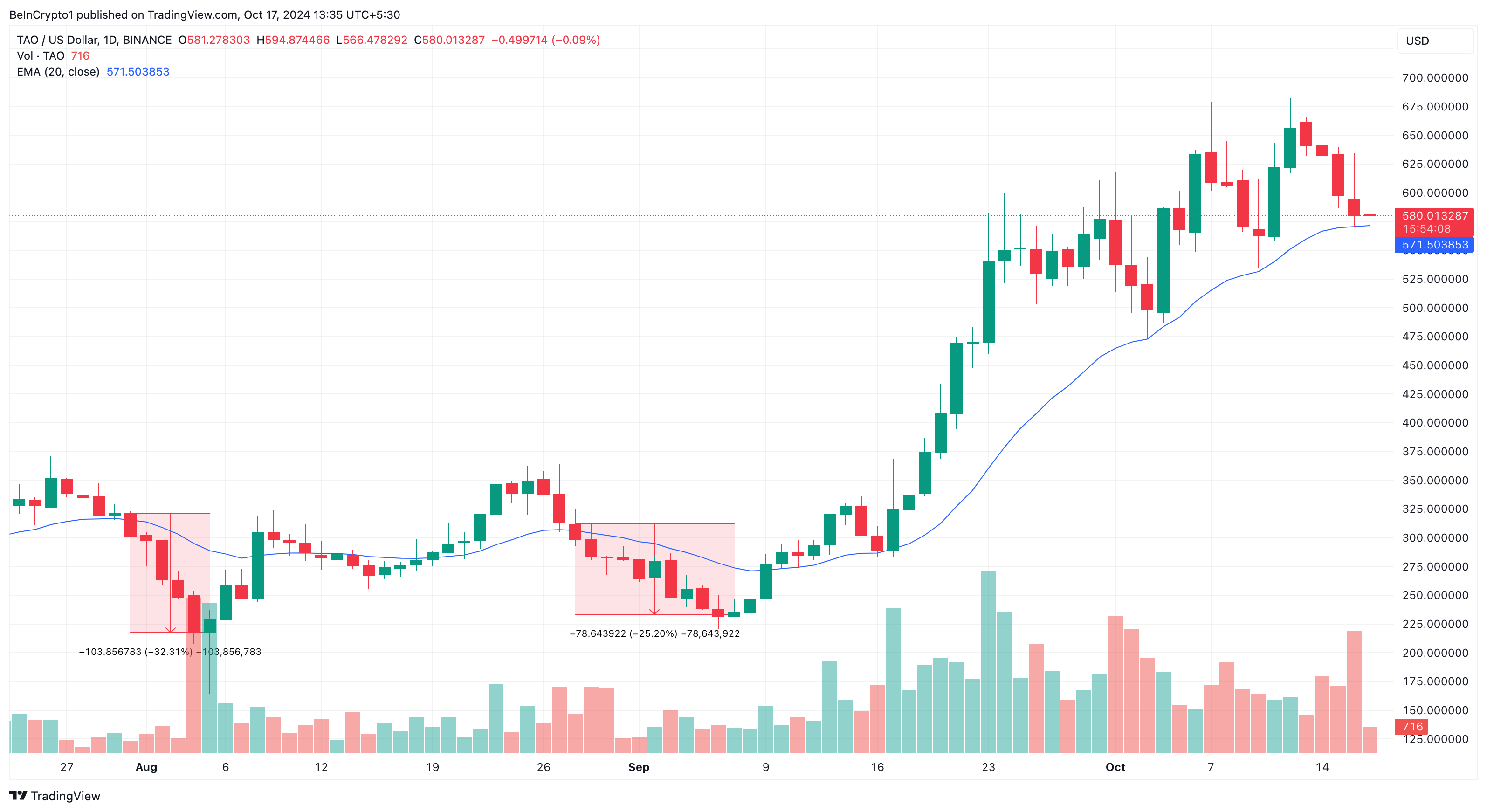 Når prisen er over EMA, er trenden bullish. Imidlertid, så snart prisen faller under terskelen, gjennomgår tokenet en korreksjon. For eksempel, da en lignende ting skjedde rundt 31. juli, falt TAOs pris med 32 % innen tre dager.