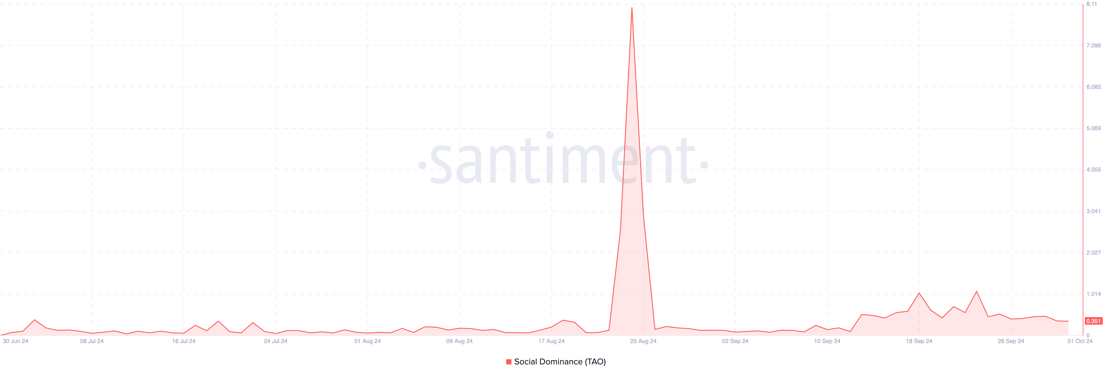 I skrivende stund har TAOs sosiale dominans falt, noe som indikerer at investorene begynner å se i en annen retning. Skulle dette vedvare noen dager, kan altcoinens kurs synke.