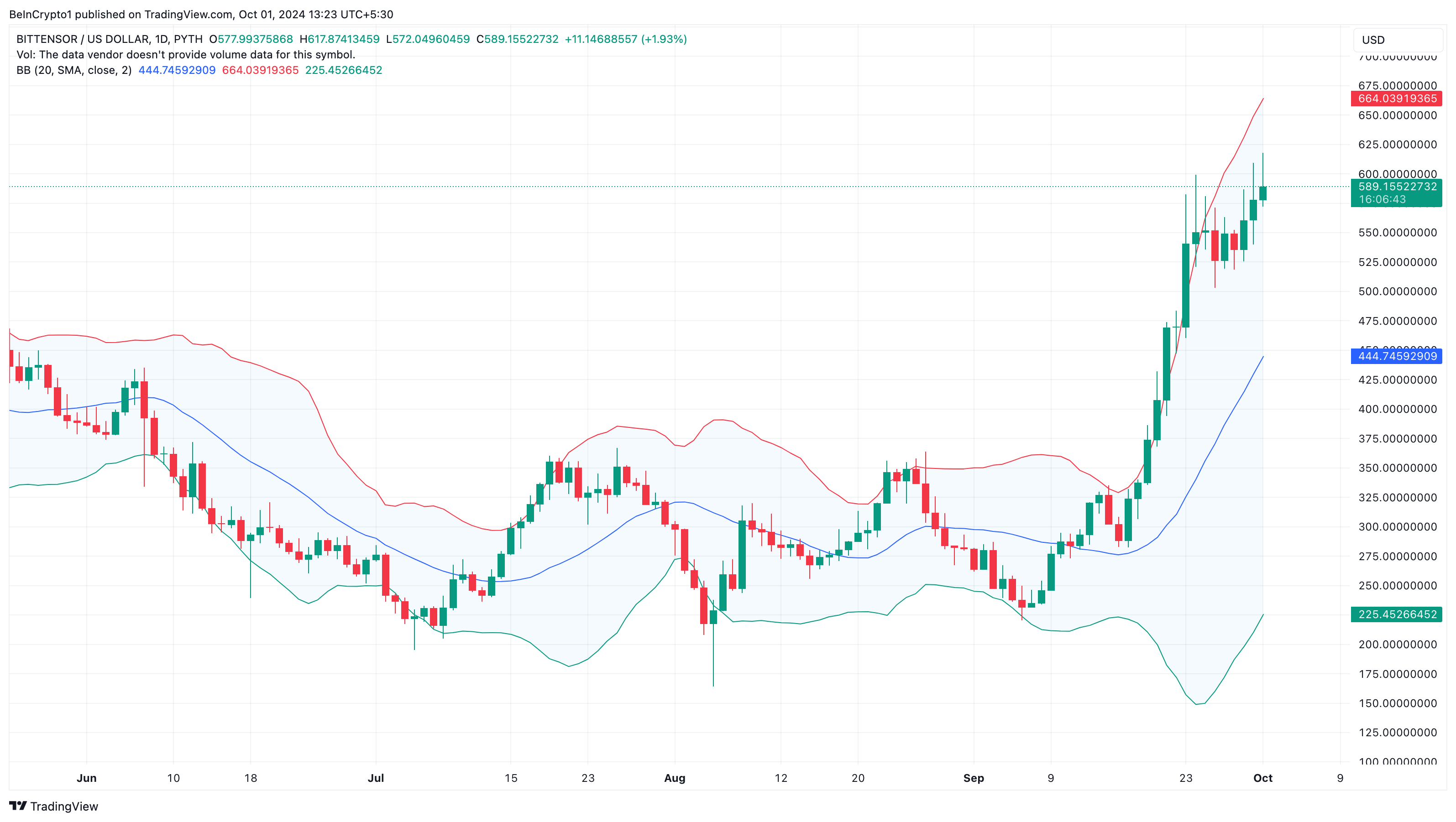 TAOs imponerende ytelse i september er tett knyttet til flere utviklinger innen kunstig intelligens (AI) sektoren. Denne økningen i interesse har forårsaket betydelige prissvingninger, som bevises av utvidelsen av Bollinger Bands (BB) på det daglige diagrammet.
