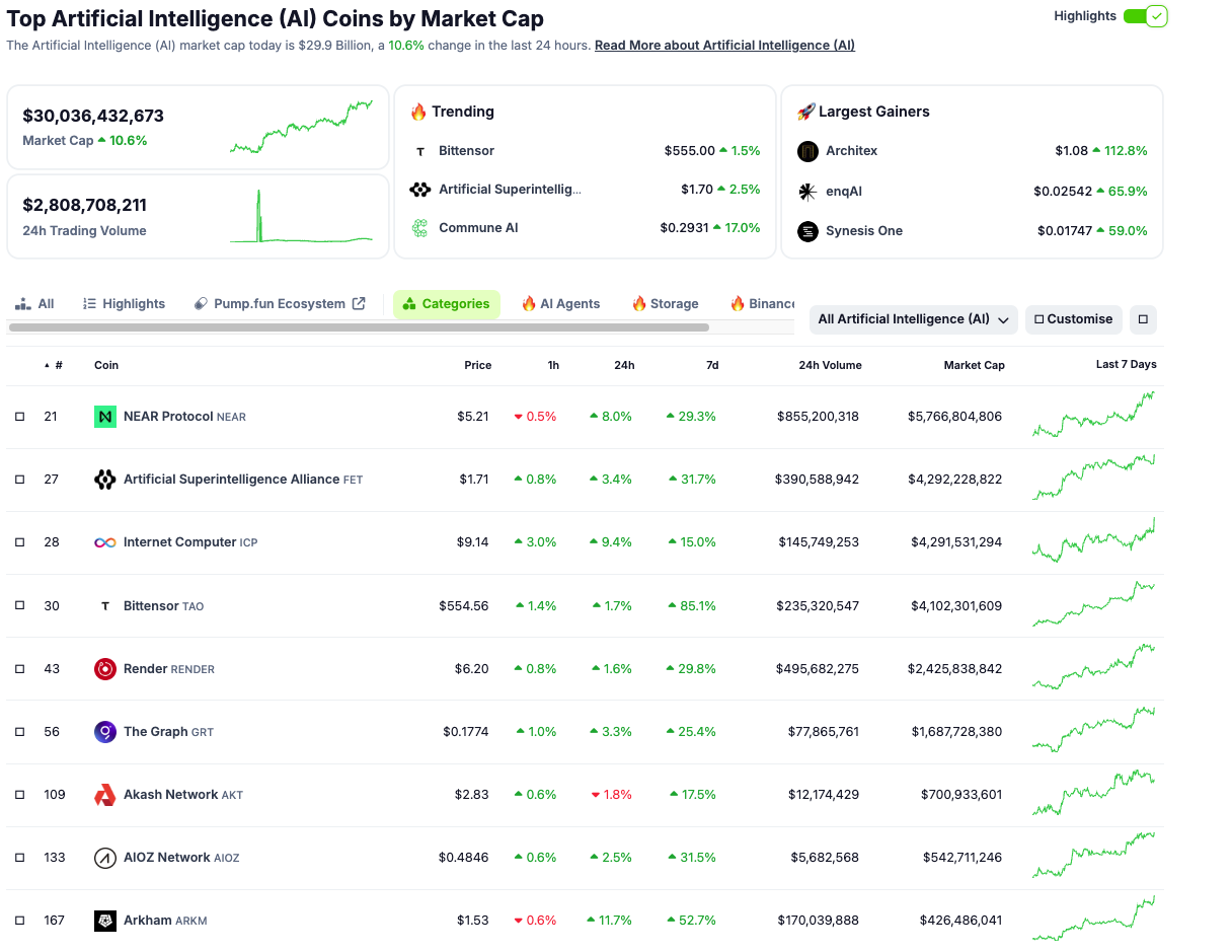 De siste 24 timene har markedsverdien av AI tokens økt med mer enn 10 %, og nådd imponerende $ 30 milliarder. I spissen for denne veksten, har Arkham opplevd en økning på 11,7 %. Internet Computer følger etter med en stigning på 9,4 %, og NEAR Protocol har klatret med 8 %, ifølge data fra CoinGecko.